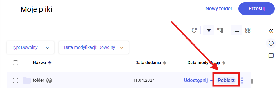 W celu pobrania danych należy skorzystać z funkcji „Pobierz” dla wybranego pliku lub folderu.