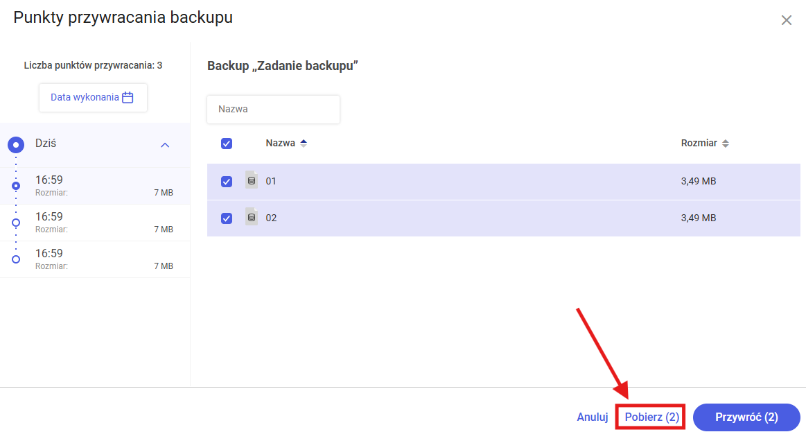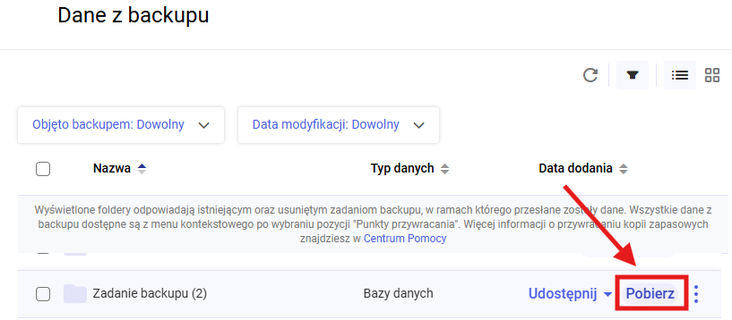 Dane z backupu baz danych można pobrać z dwóch obszarów: