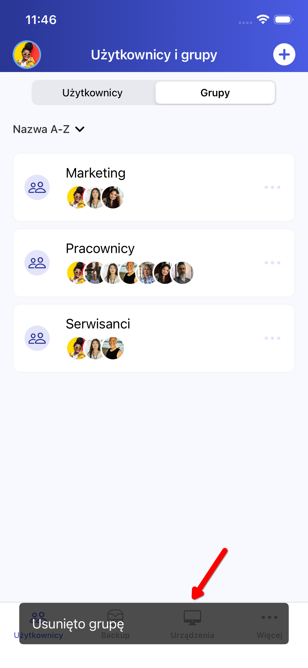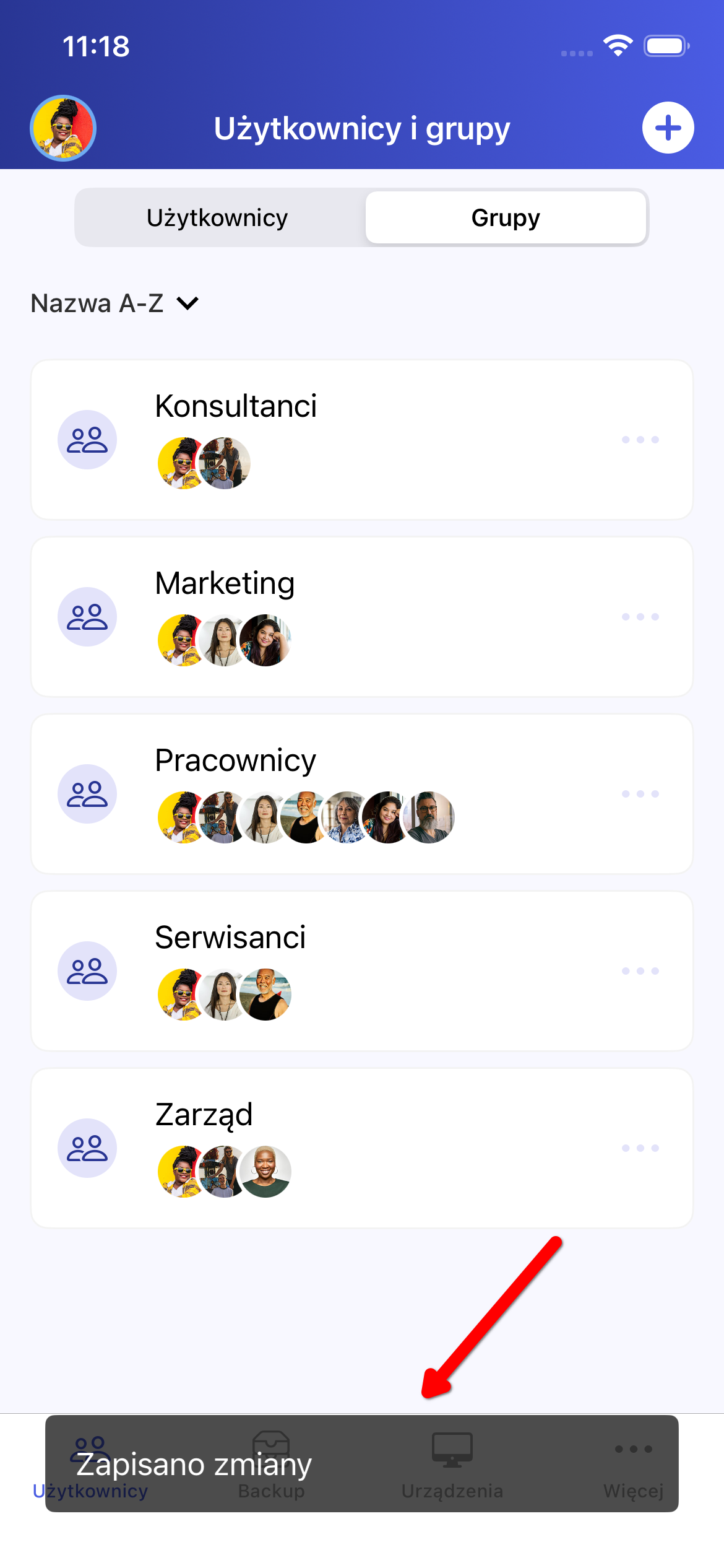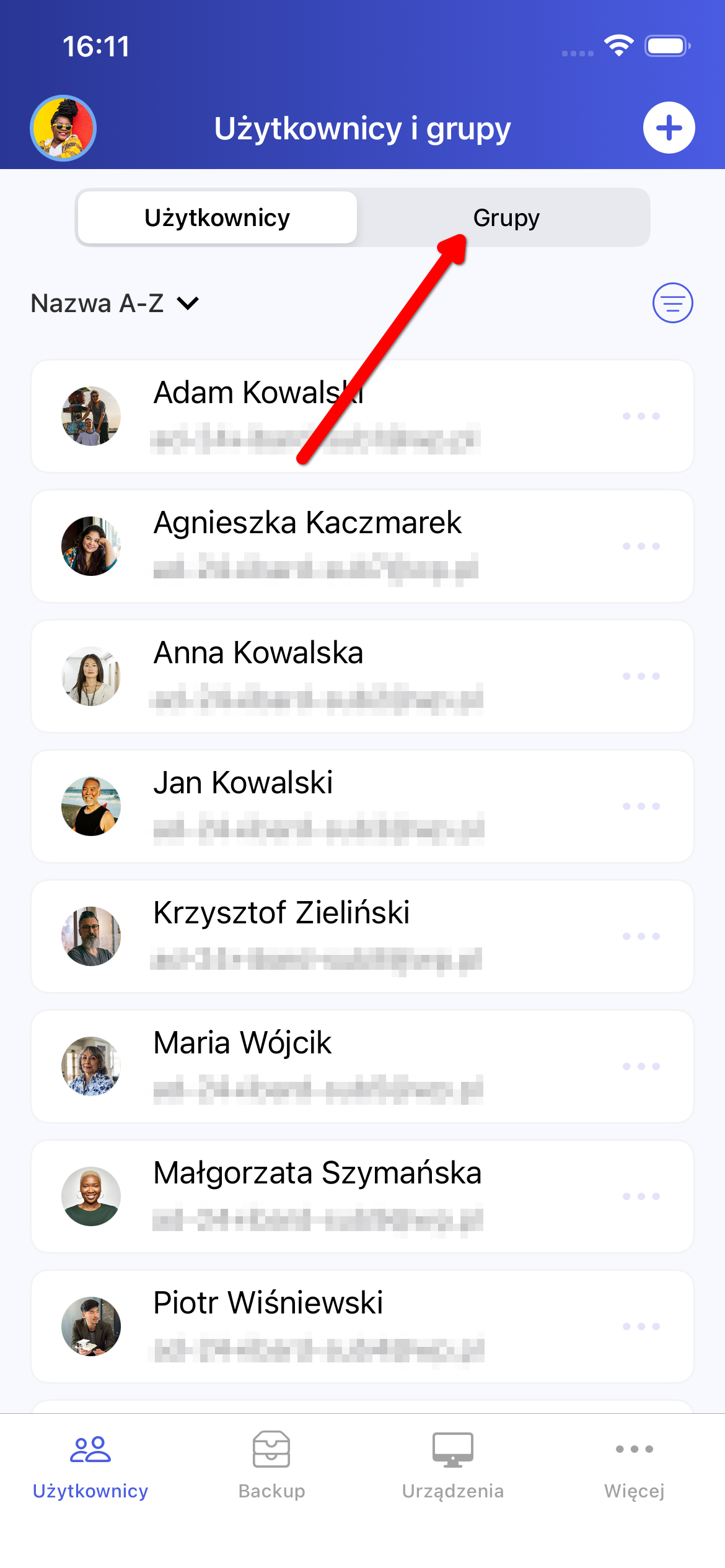 Przełączanie między widokiem „Użytkownicy” oraz „Grupy”