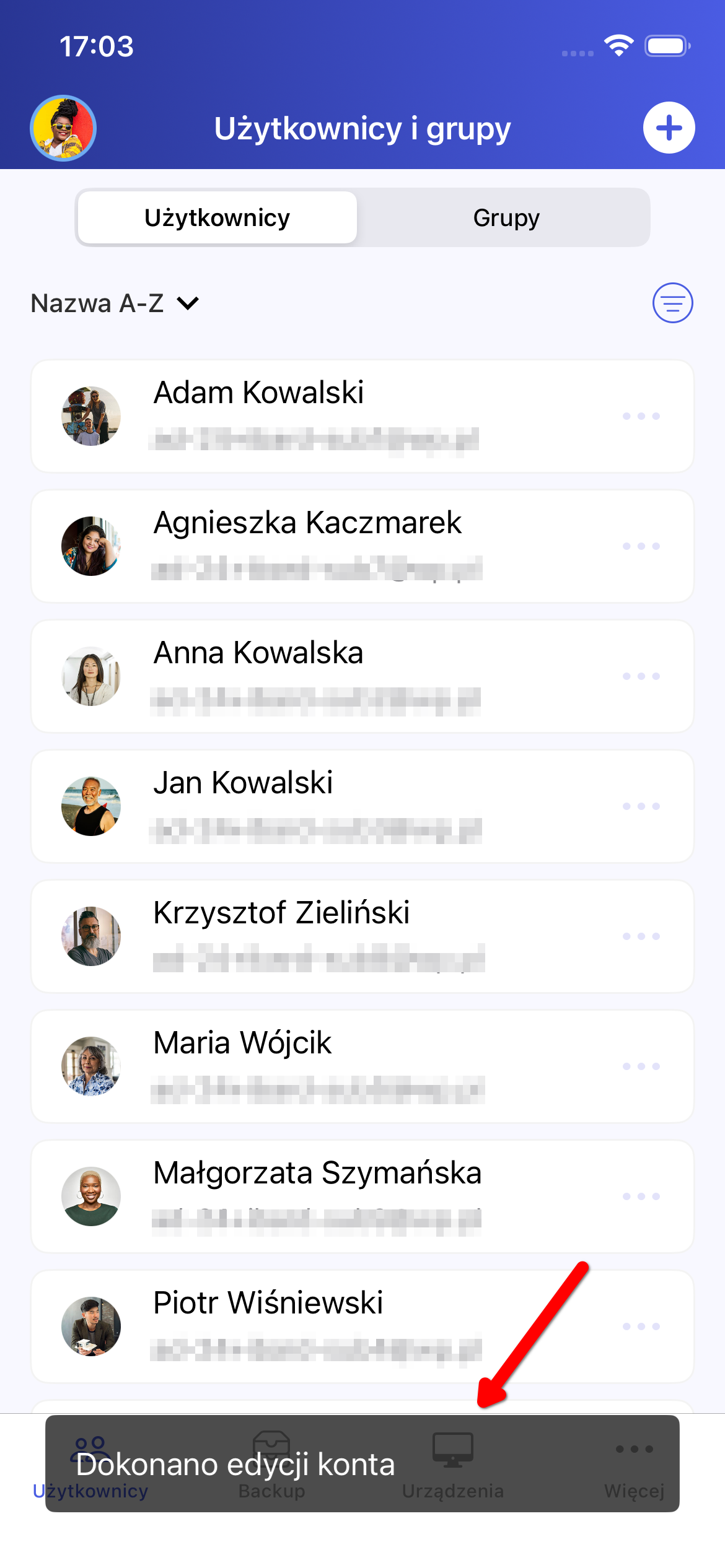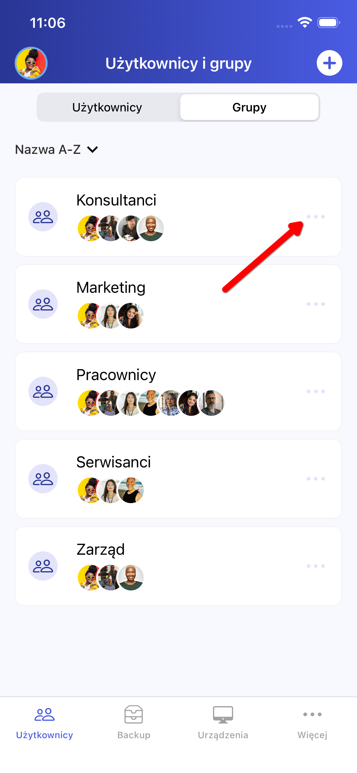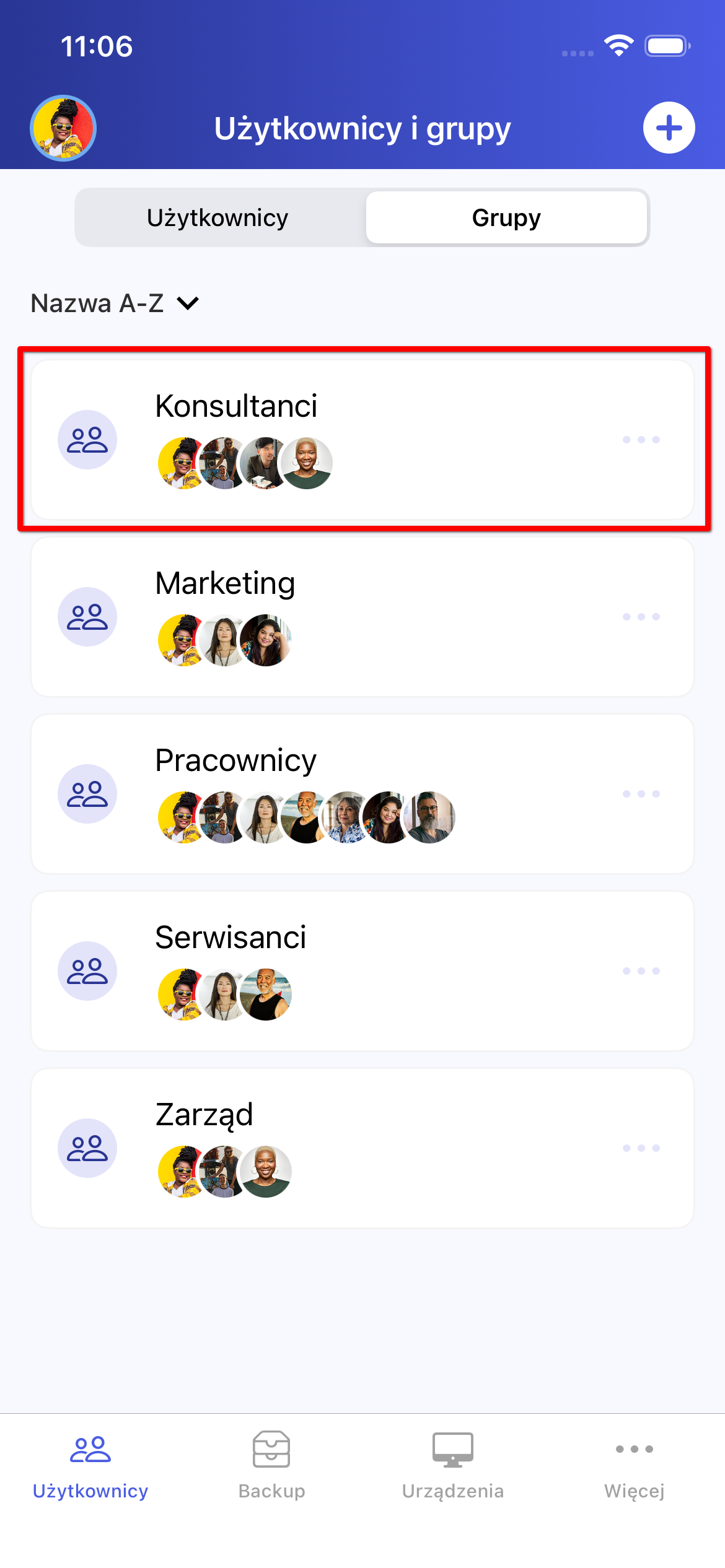 Przełączanie między widokiem „Użytkownicy” oraz „Grupy”
