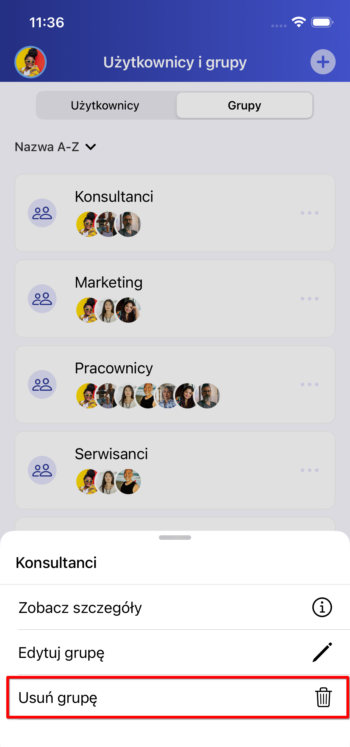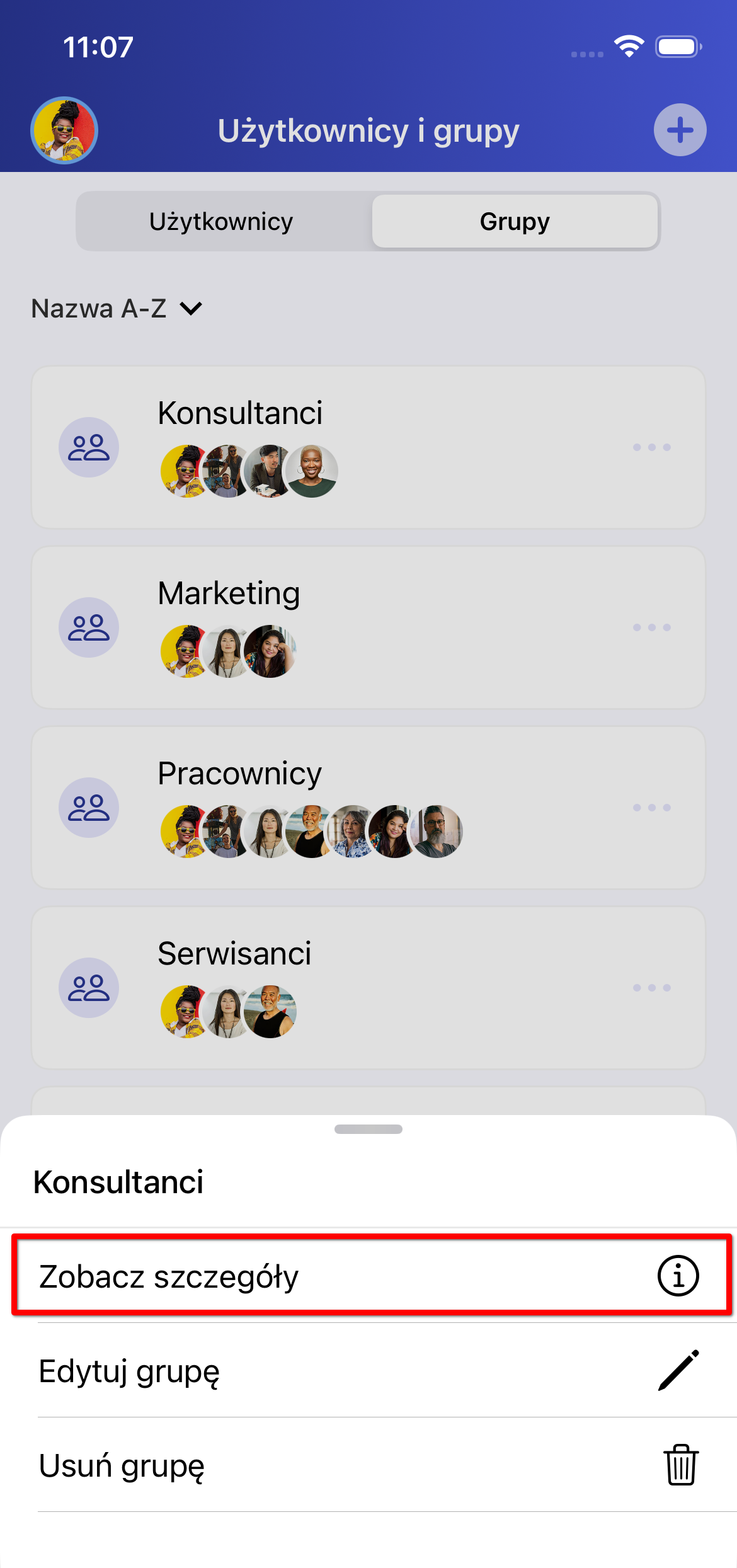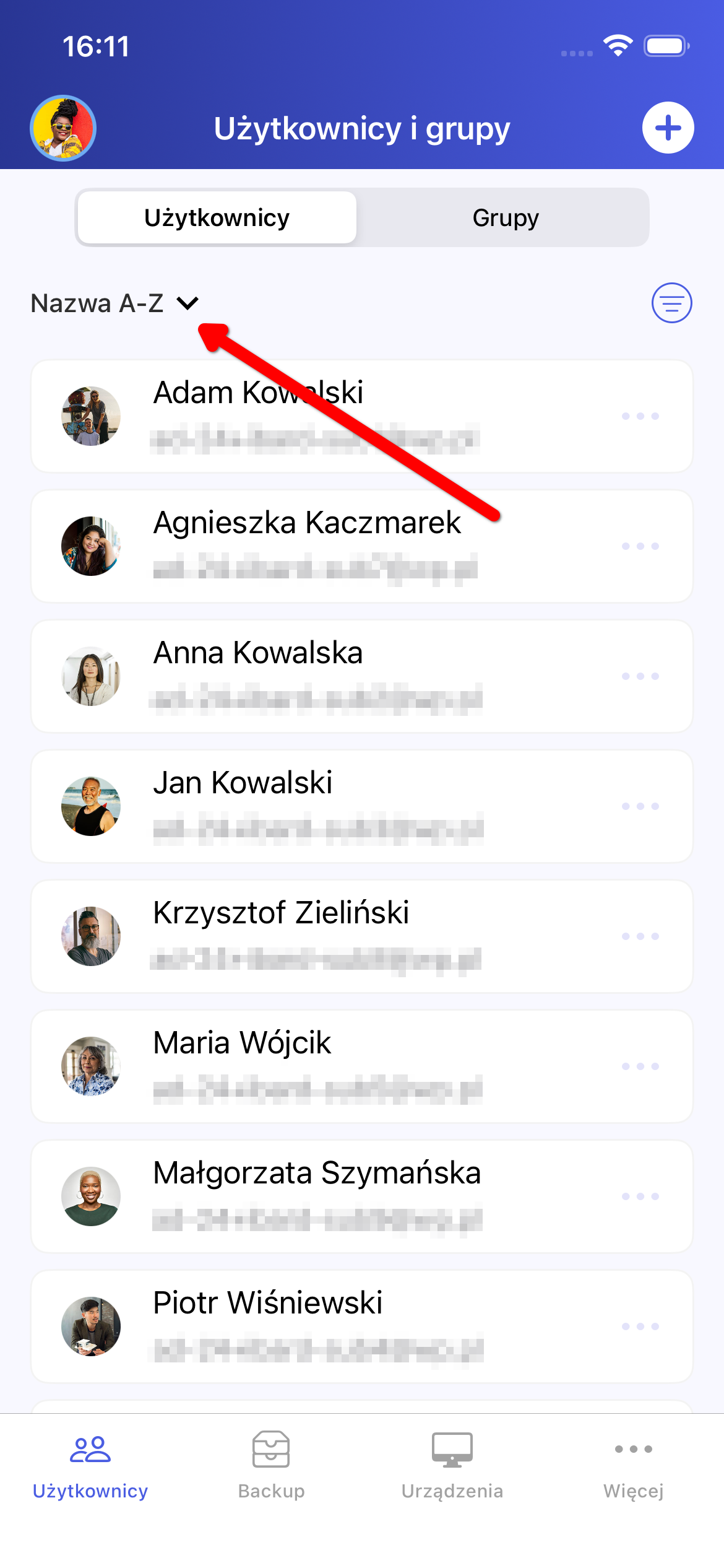 Zarówno lista użytkowników, jak i grup może być sortowana. W widoku użytkowników sortowanie odbywa się według imienia, natomiast w widoku grup – według ich nazwy. Domyślnie lista ustawiona jest w porządku alfabetycznym (A-Z).