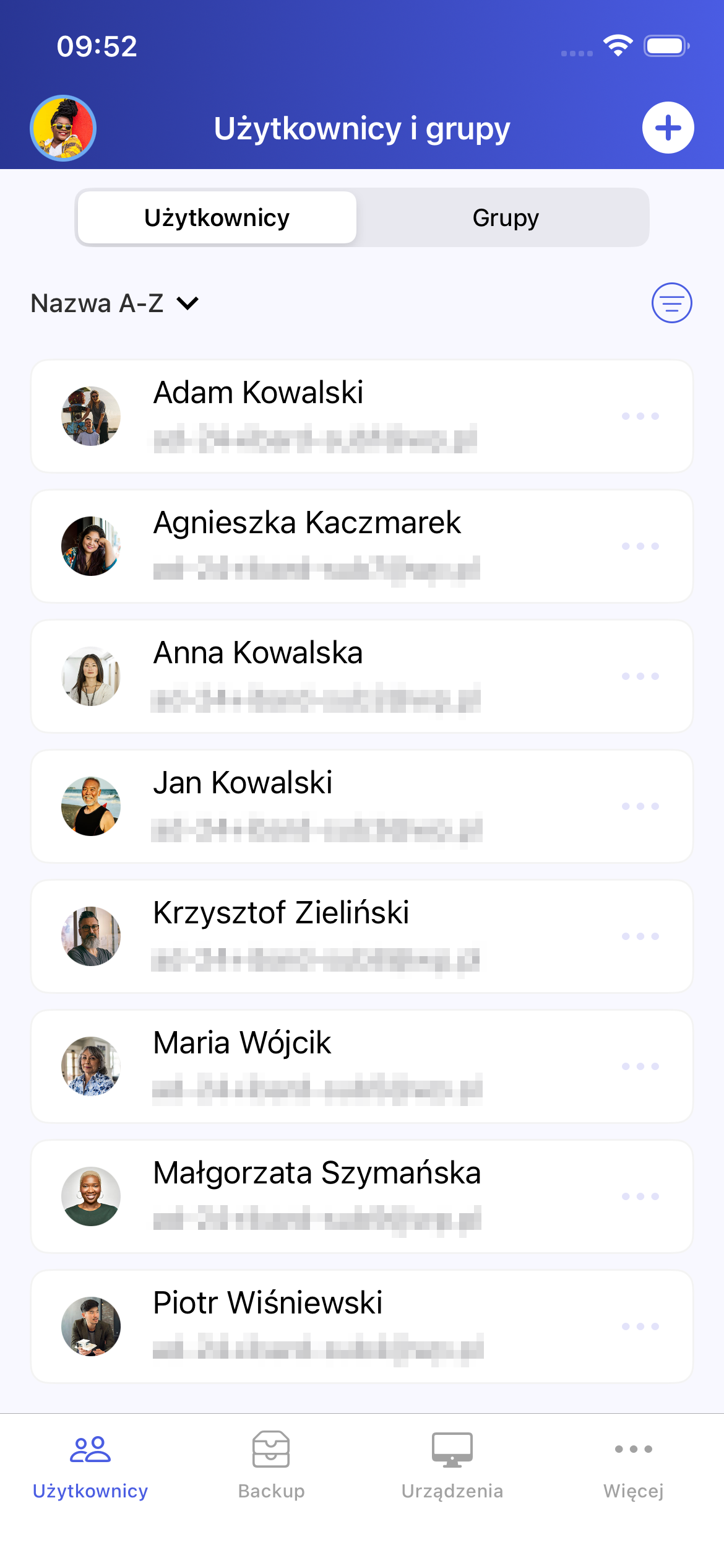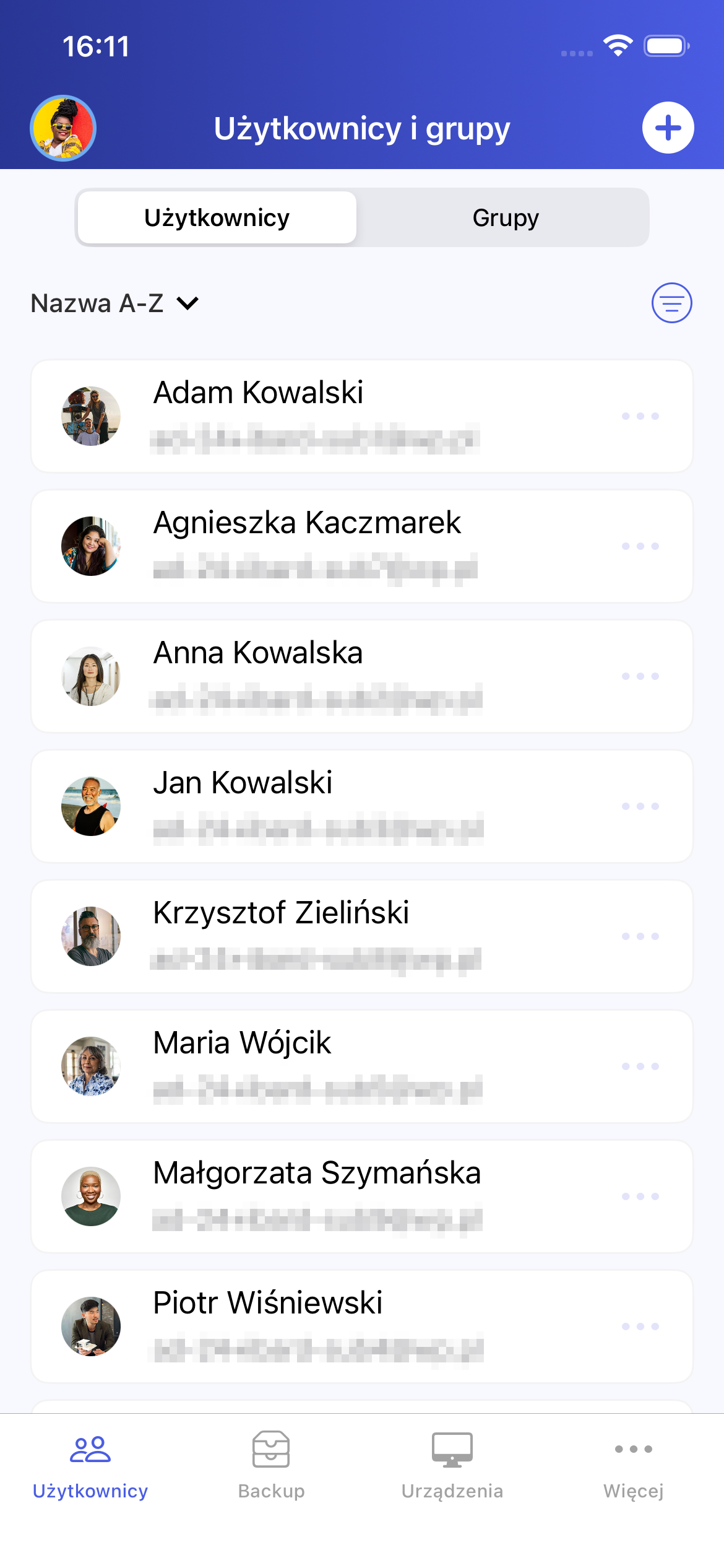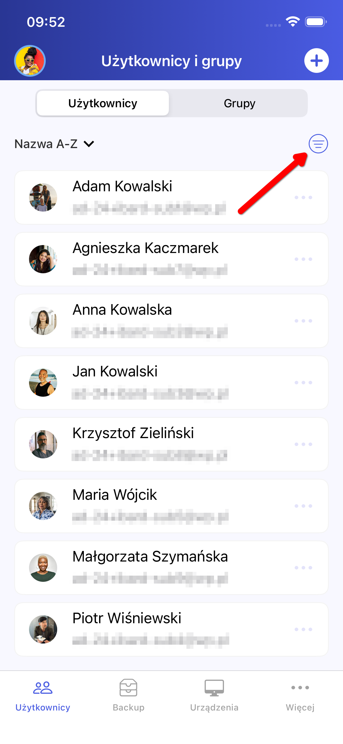 Zarówno lista użytkowników, jak i grup może być sortowana. W widoku użytkowników sortowanie odbywa się według imienia, natomiast w widoku grup – według ich nazwy. Domyślnie lista ustawiona jest w porządku alfabetycznym (A-Z).