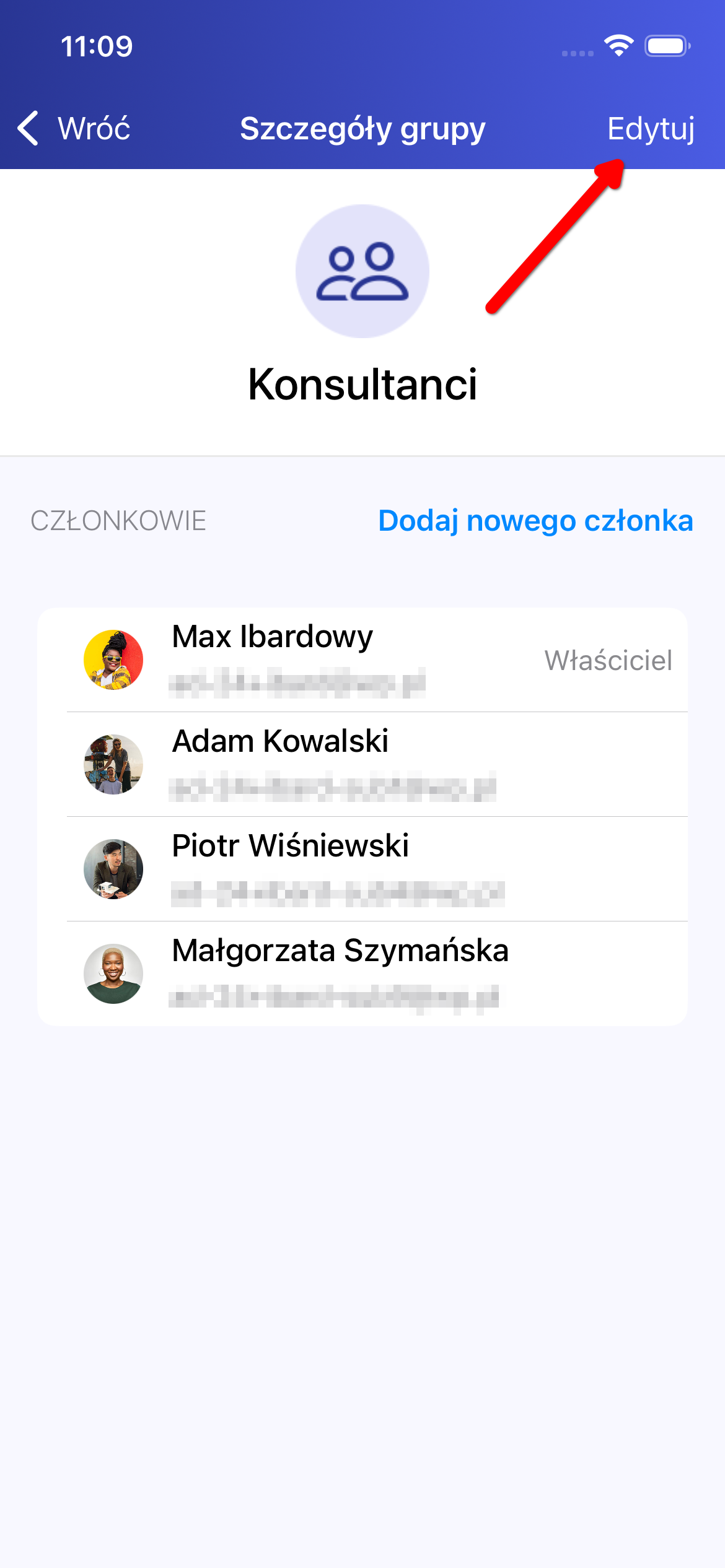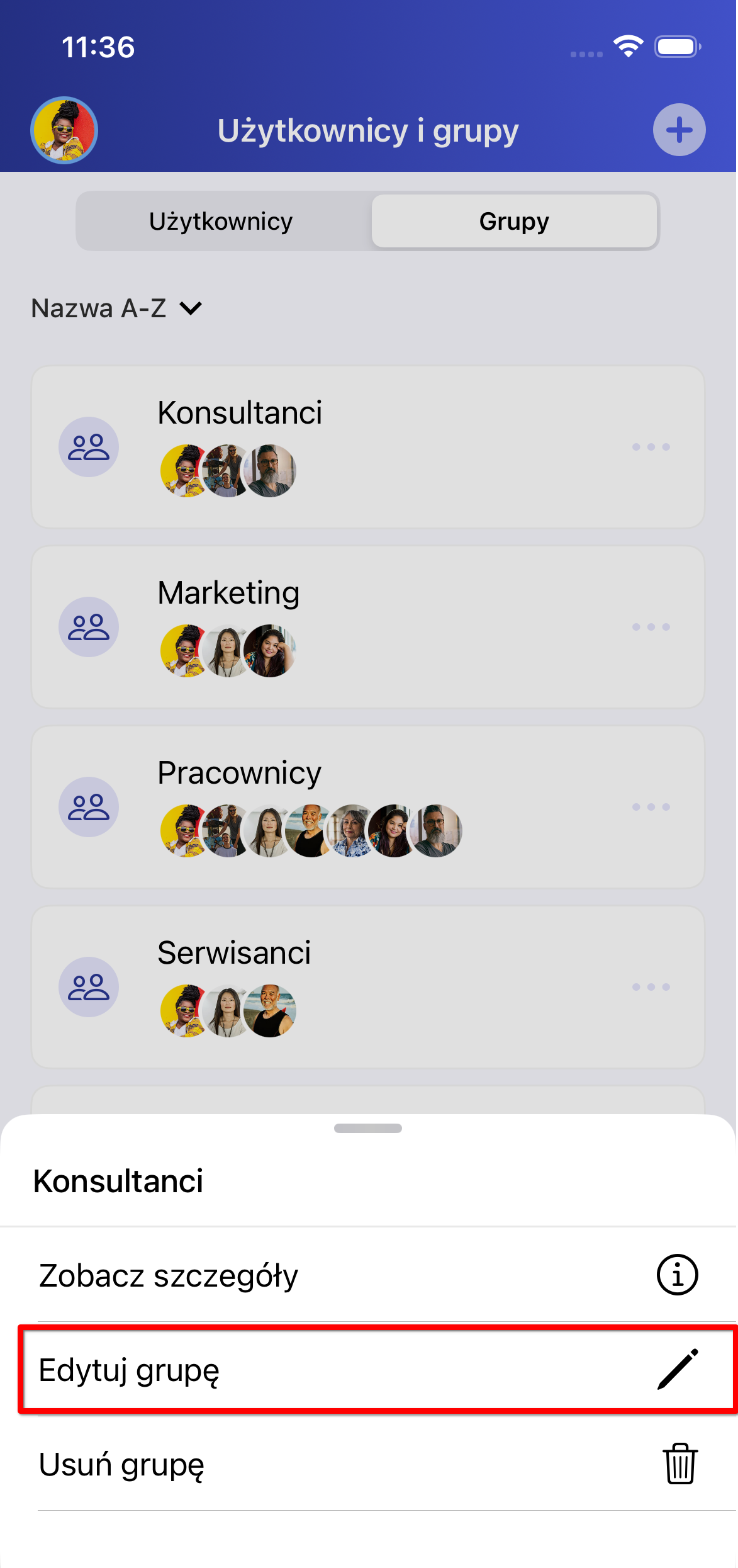 W celu zmiany parametrów grupy należy rozwinąć menu trzech kropek i wybrać opcję „Edytuj grupę” (Rysunek 57):