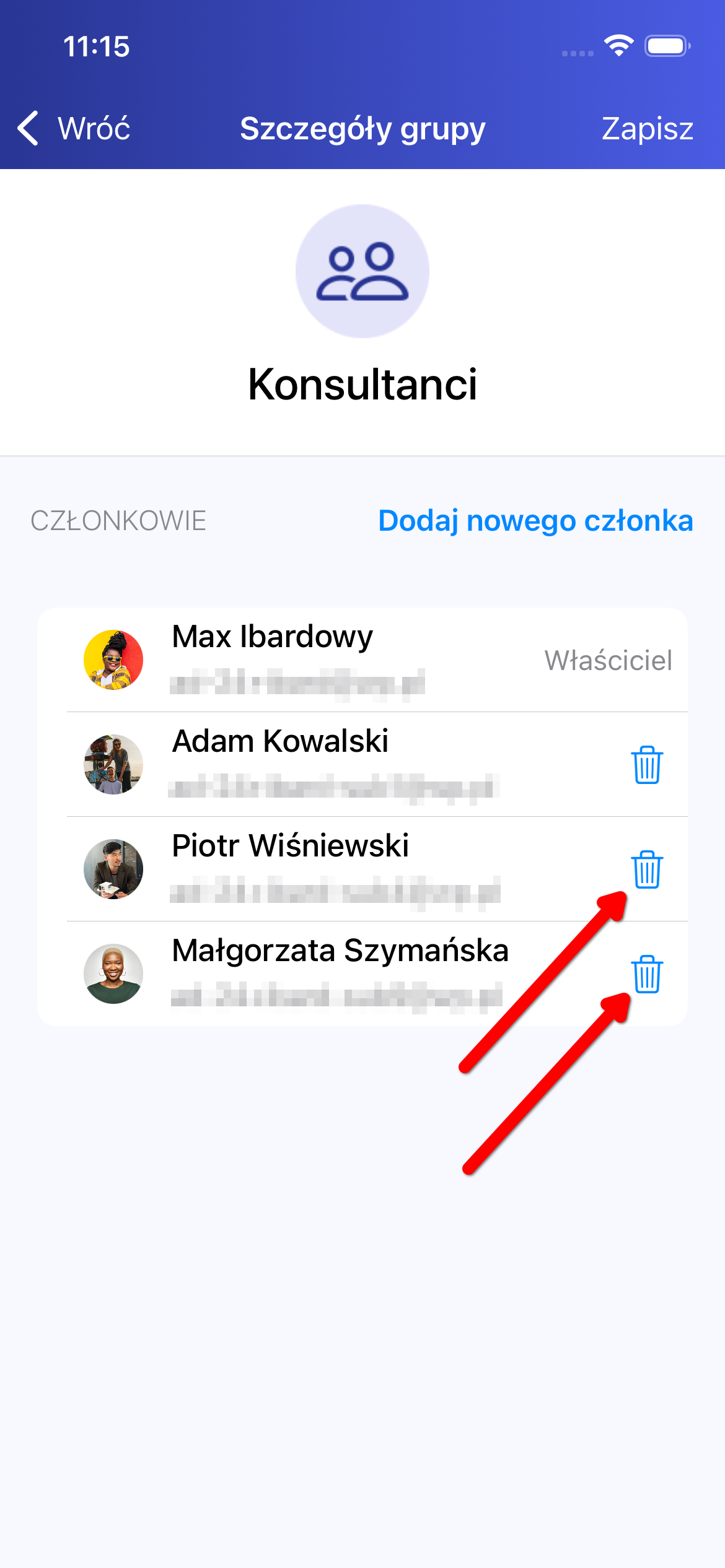 Aby wykluczyć użytkownika z przynależności do grupy, należy kliknąć w ikonę kosza przy jego nazwisku (Rysunek 49).