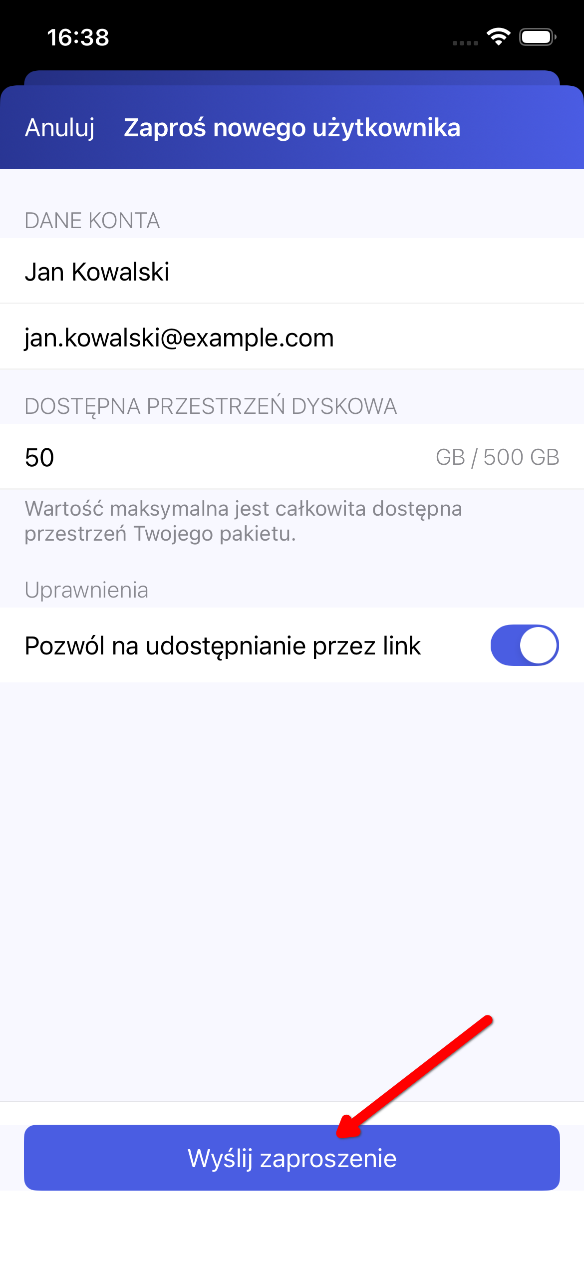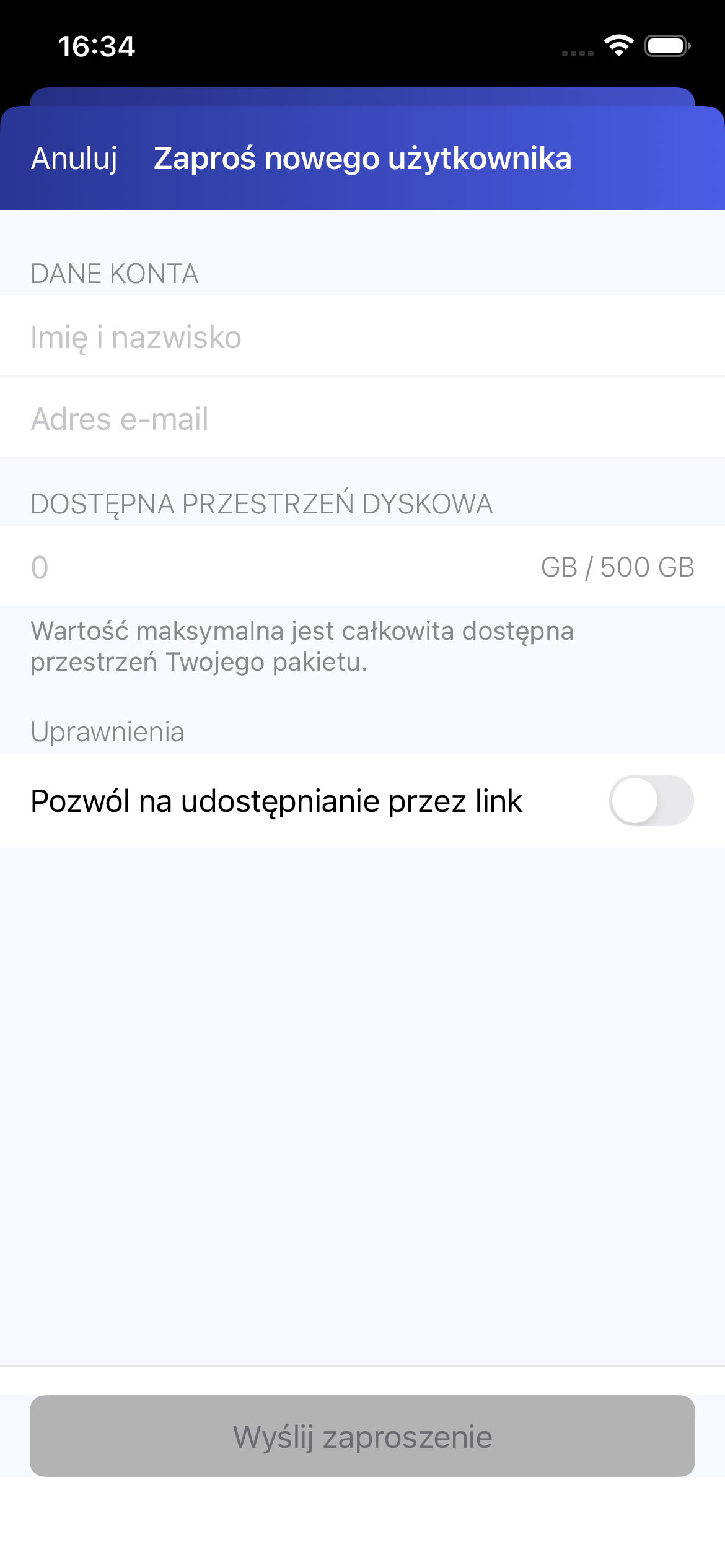 Zostanie wyświetlony formularz, w którym należy uzupełnić dane nowej osoby. Do momentu wprowadzenia wszystkich wymaganych informacji (Imię i nazwisko, Adres e-mail, Dostępna przestrzeń dyskowa), przycisk „Wyślij zaproszenie” pozostanie nieaktywny (Rysunek 6).