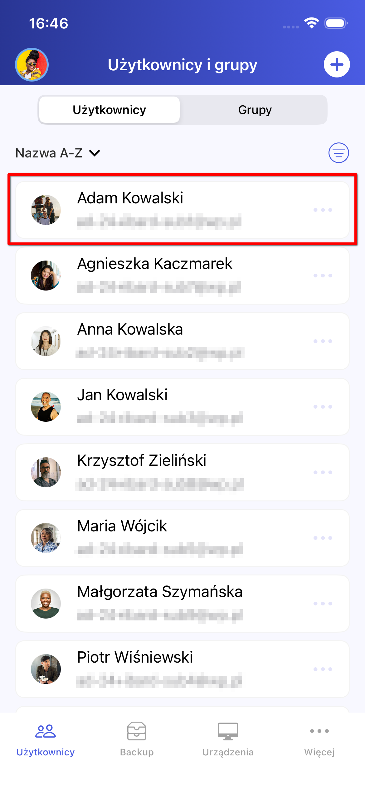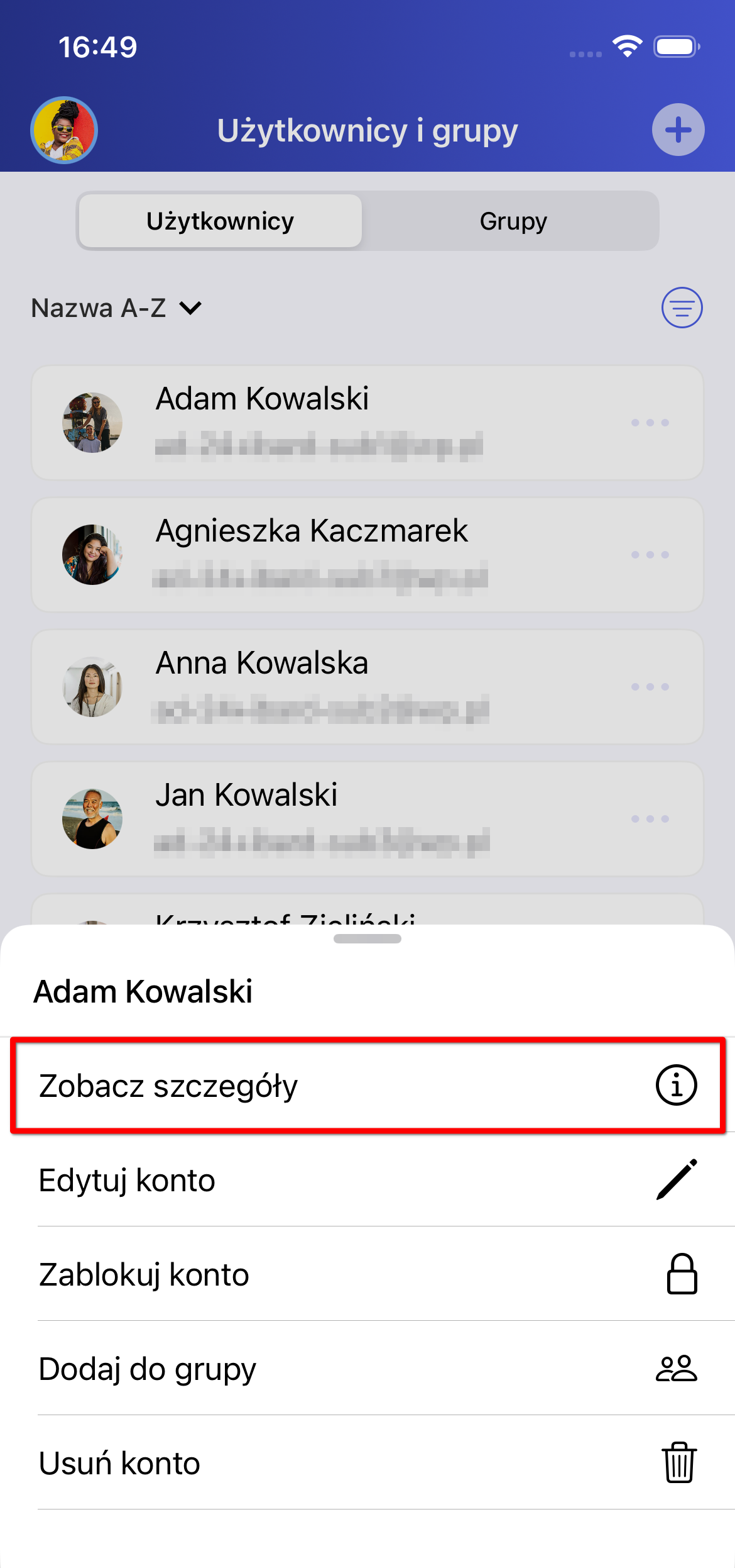 Przejście do szczegółów użytkownika jest możliwe na dwa sposoby. Pierwszą opcją jest kliknięcie w dowolny obszar wiersza danego użytkownika na liście (Rysunek 9):