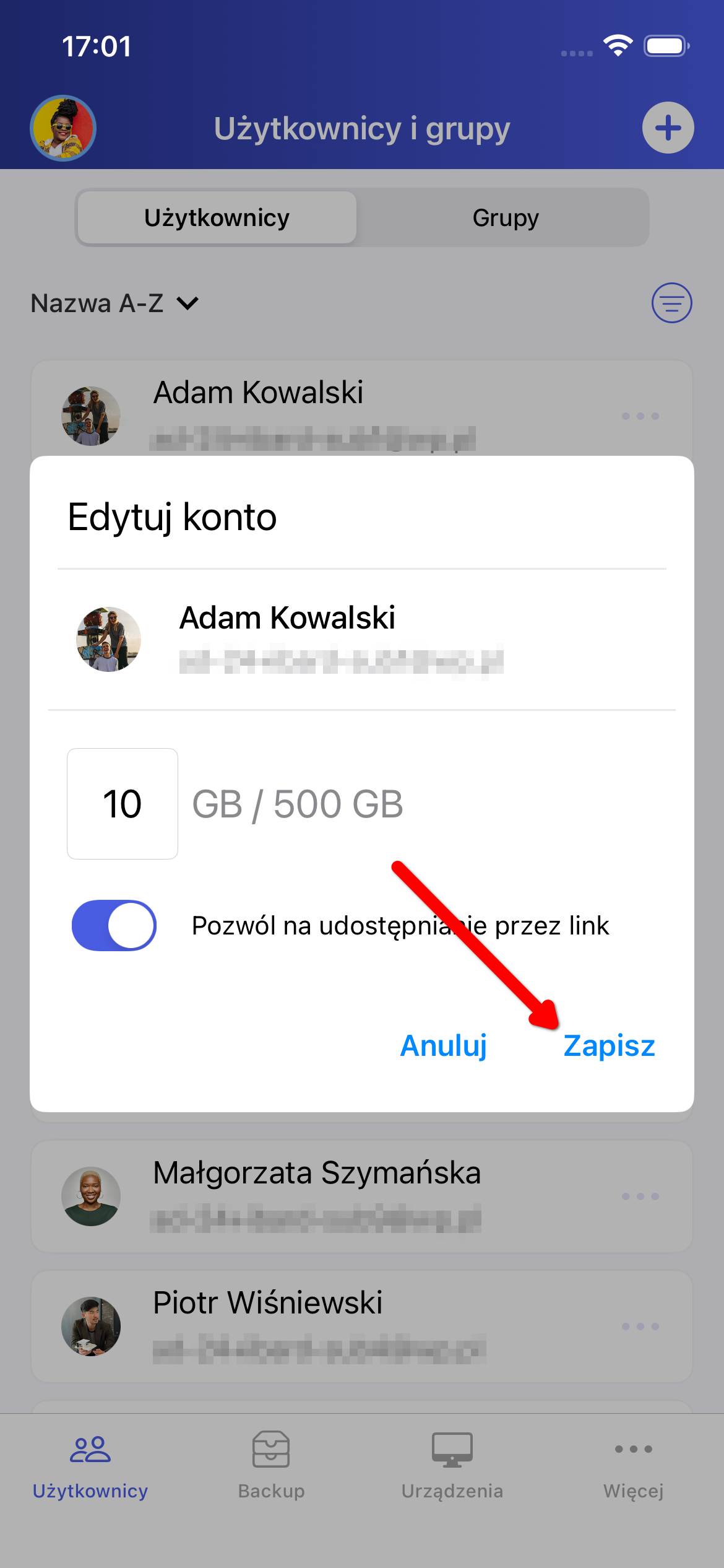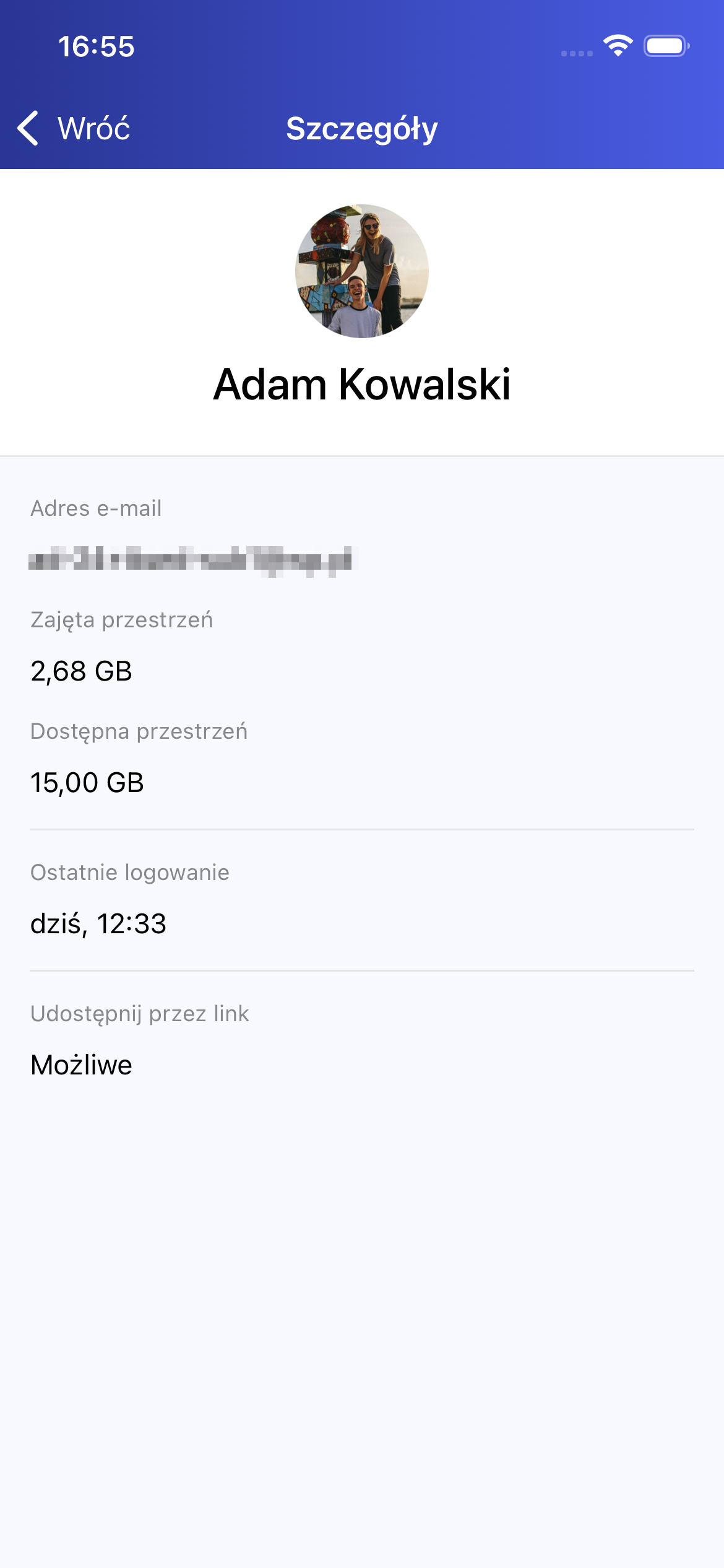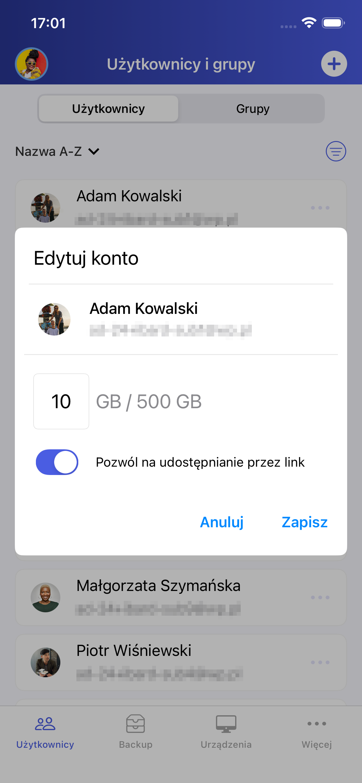 W oknie edycji możliwa jest modyfikacja przydzielonej przestrzeni oraz zmiana ustawienia dotyczącego udostępniania plików przez link (Rysunek 14).