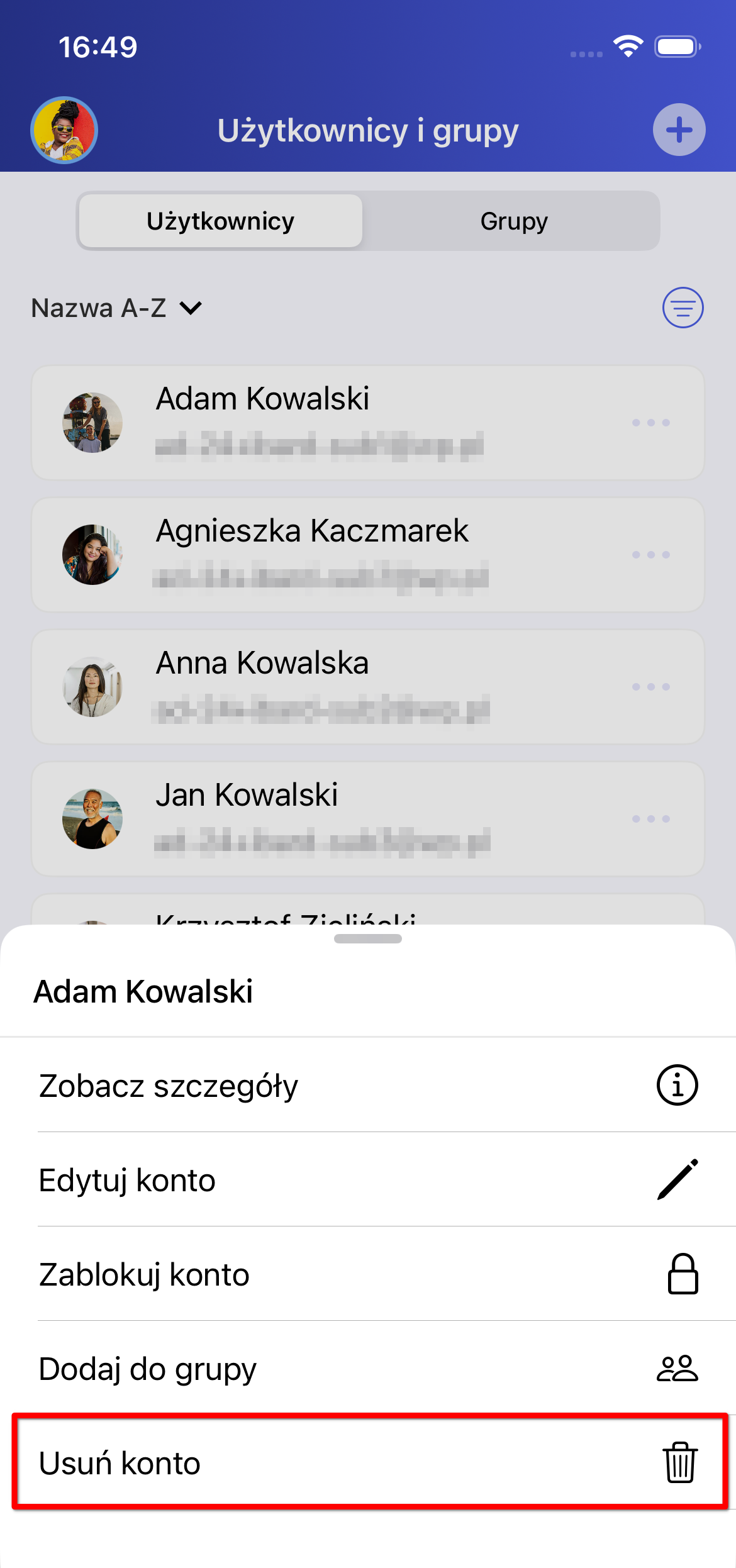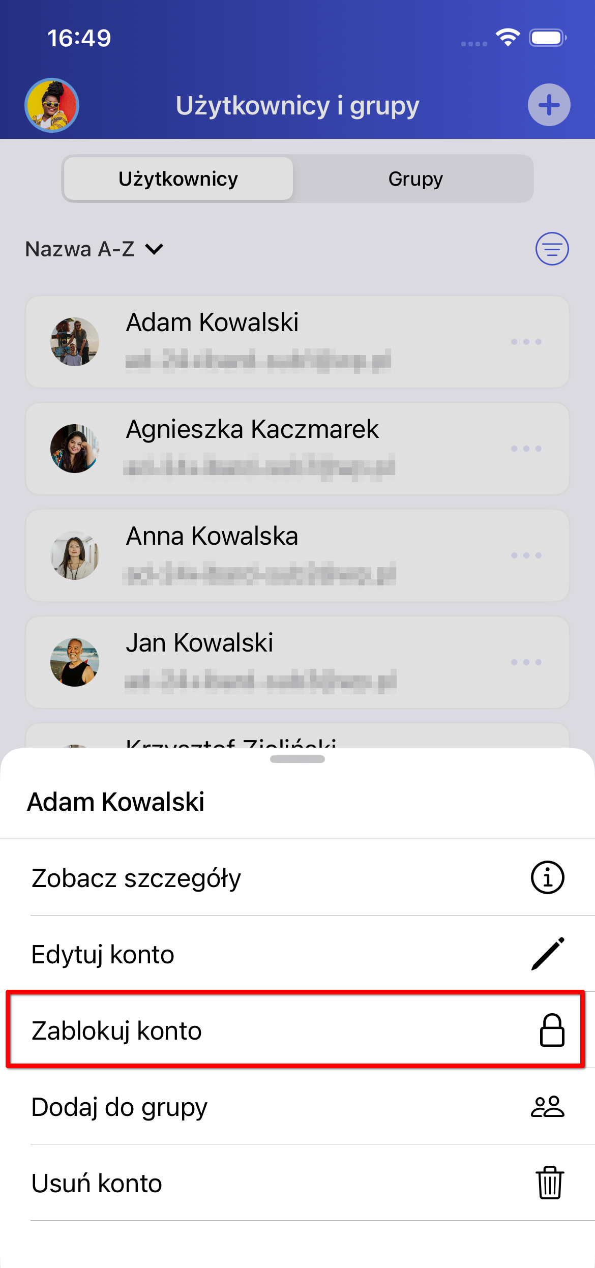 Aby zablokować konto, należy skorzystać z ikony trzech kropek, a następnie wybrać opcję „Zablokuj konto” (Rysunek 17):