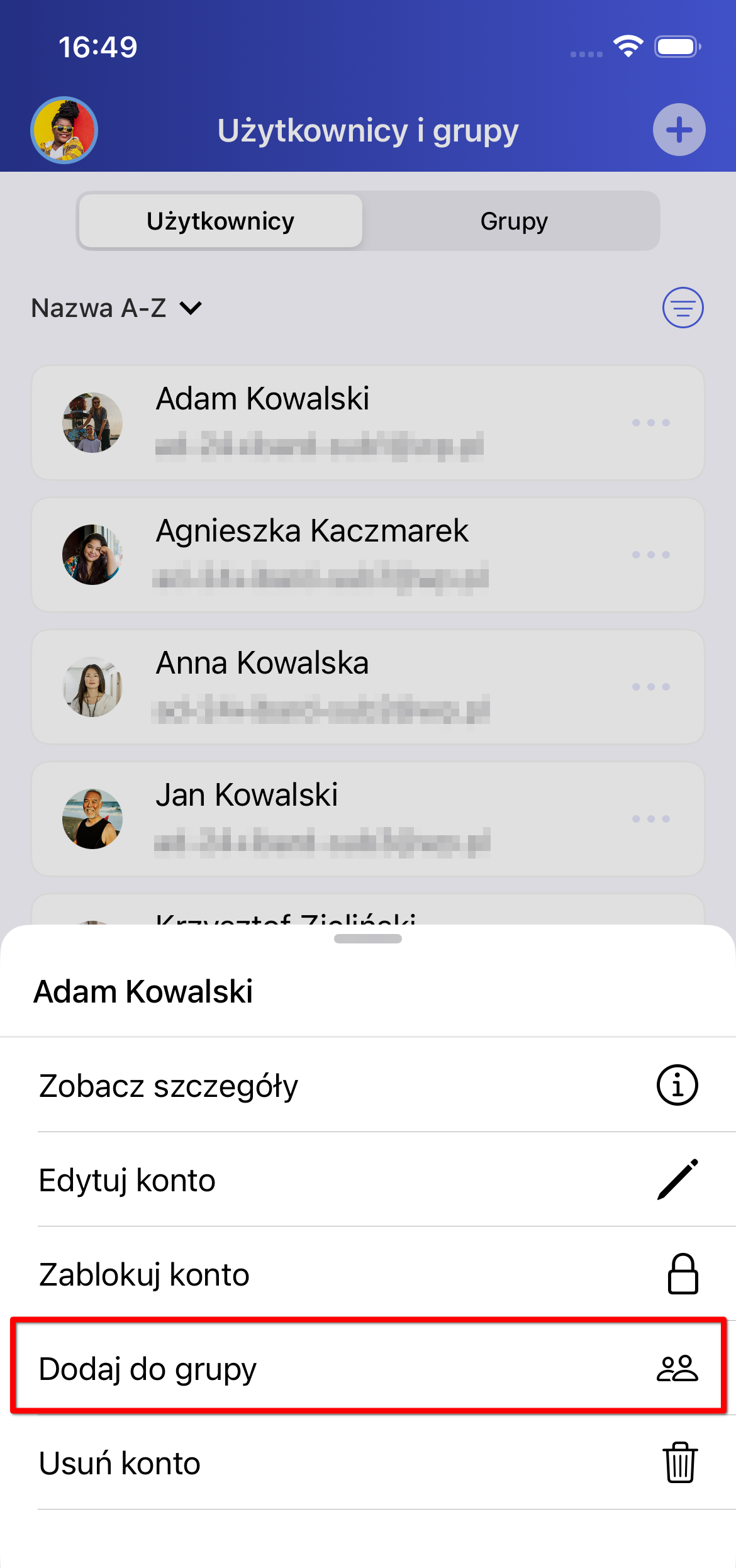 W celu przypisania użytkownika do grupy należy otworzyć menu opcji dodatkowych i wybrać funkcję „Dodaj do grupy” (Rysunek 21):