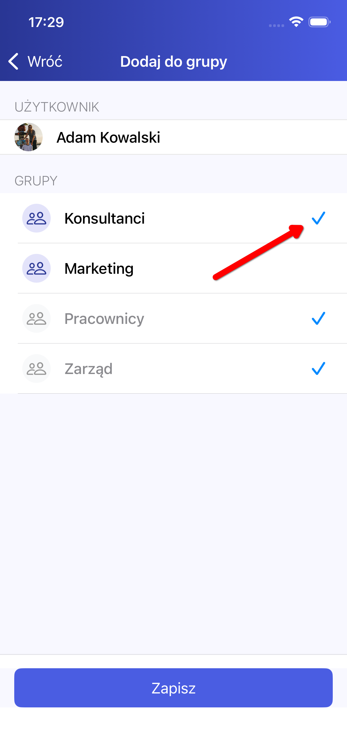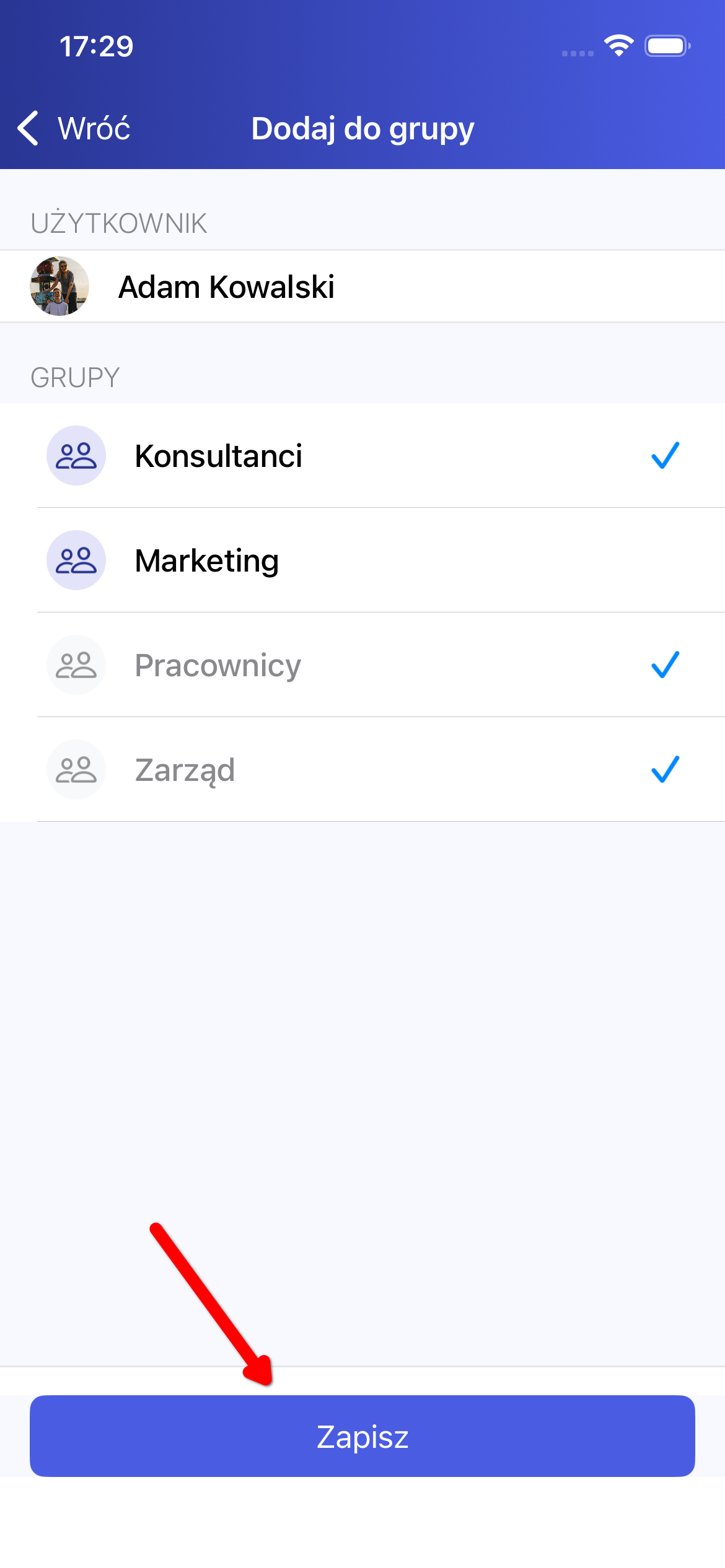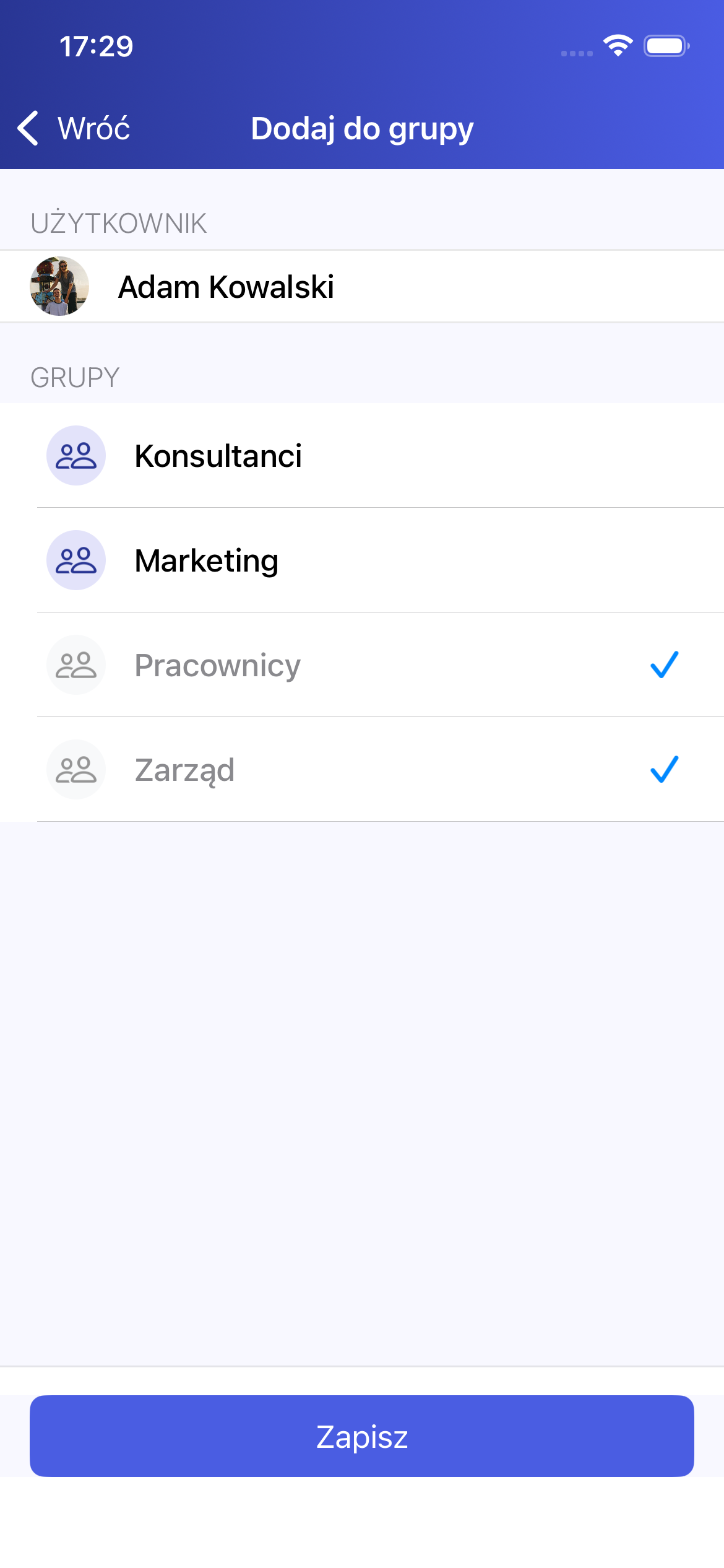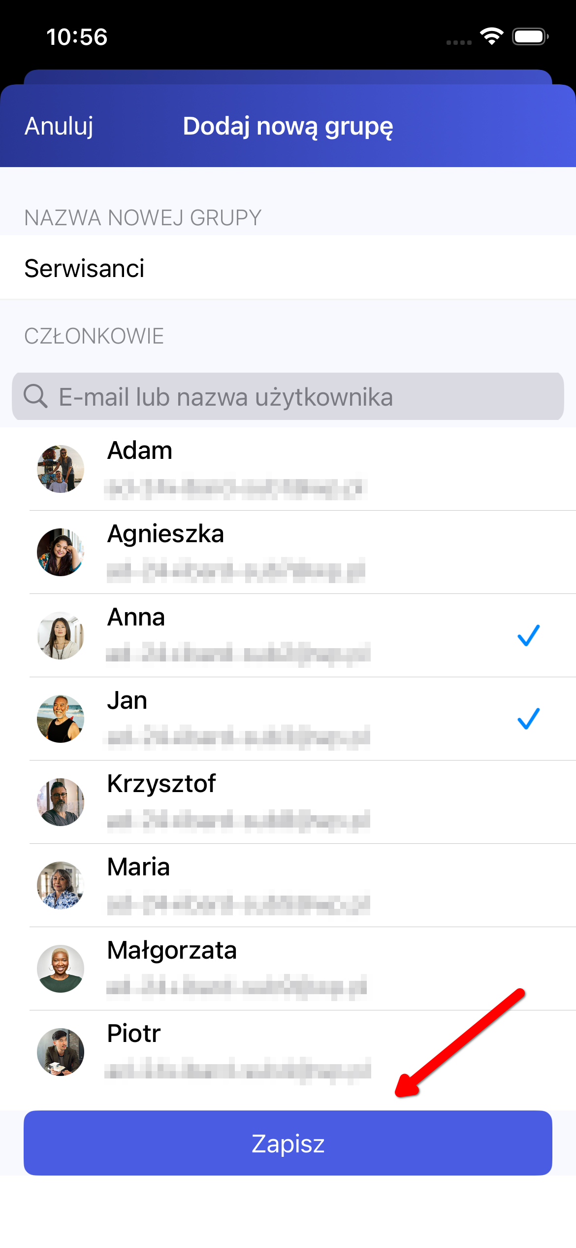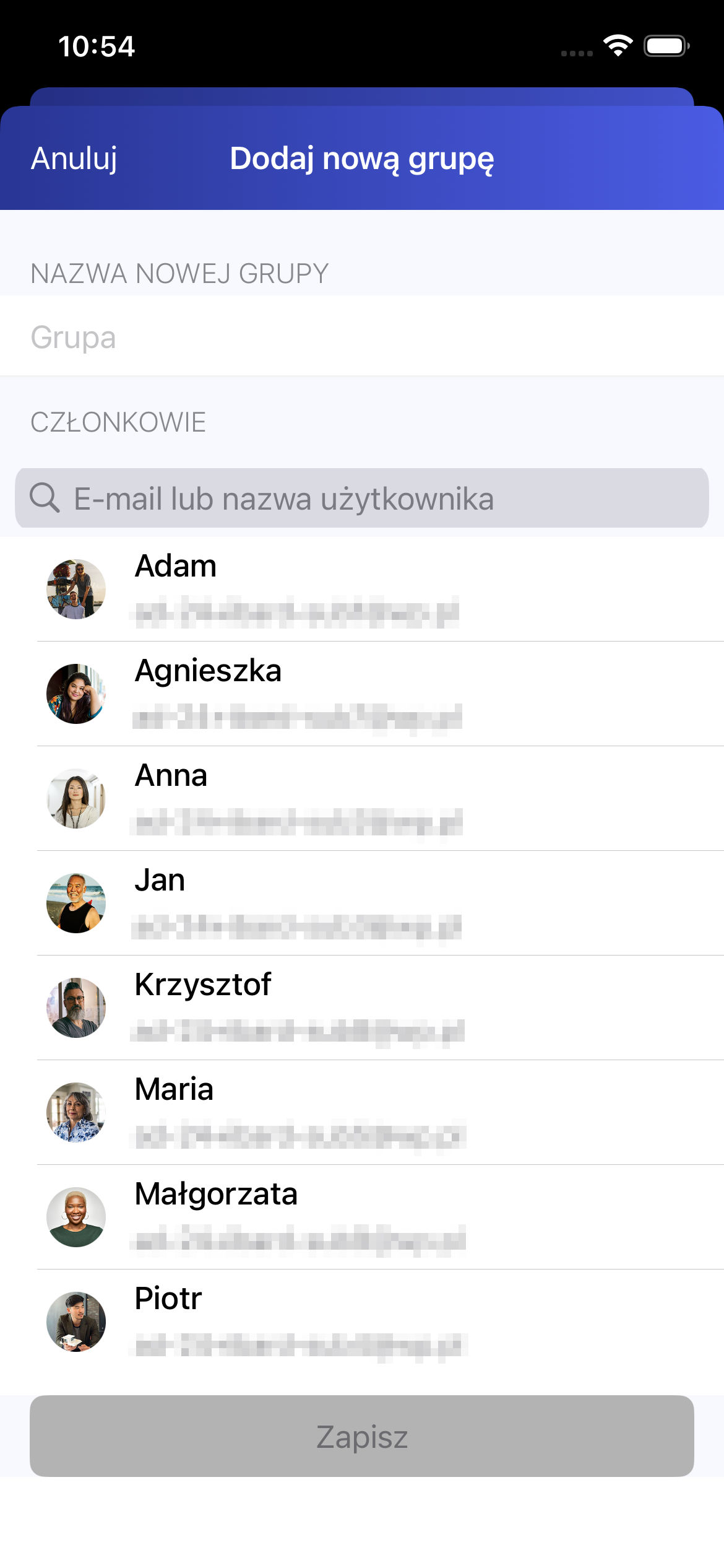 Po uzupełnieniu nazwy grupy przycisk „Zapisz” stanie się aktywny. Opcjonalnie można od razu zaznaczyć użytkowników, którzy mają zostać przypisani do grupy. W tym celu należy kliknąć w komórkę danego użytkownika, co zostanie potwierdzone ikoną wyboru po prawej stronie. W celu sfinalizowania procesu należy kliknąć przycisk „Zapisz” (Rysunek 41).