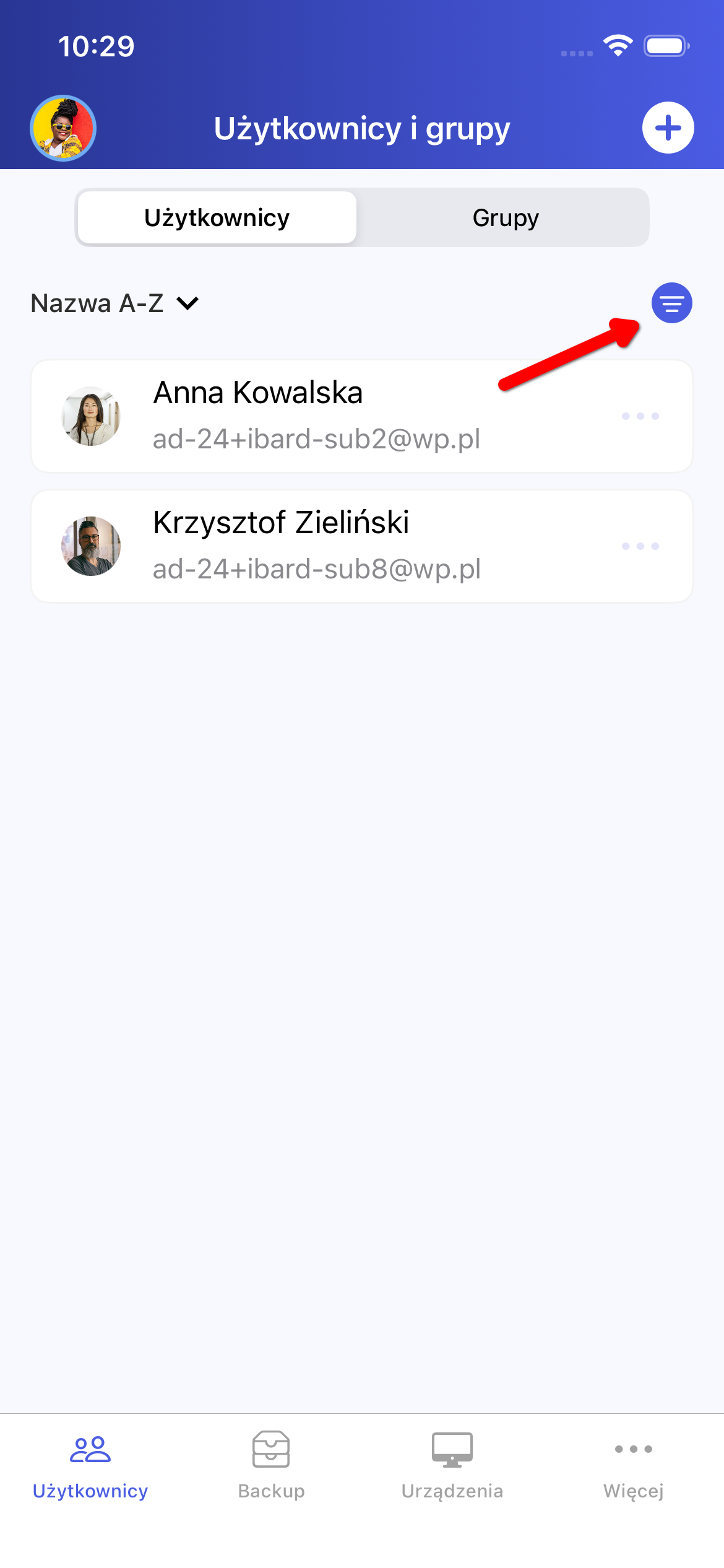 Istnieje możliwość filtrowania listy użytkowników. W celu uruchomienia tej funkcji należy kliknąć w przycisk zaznaczony poniżej (Rysunek 29):