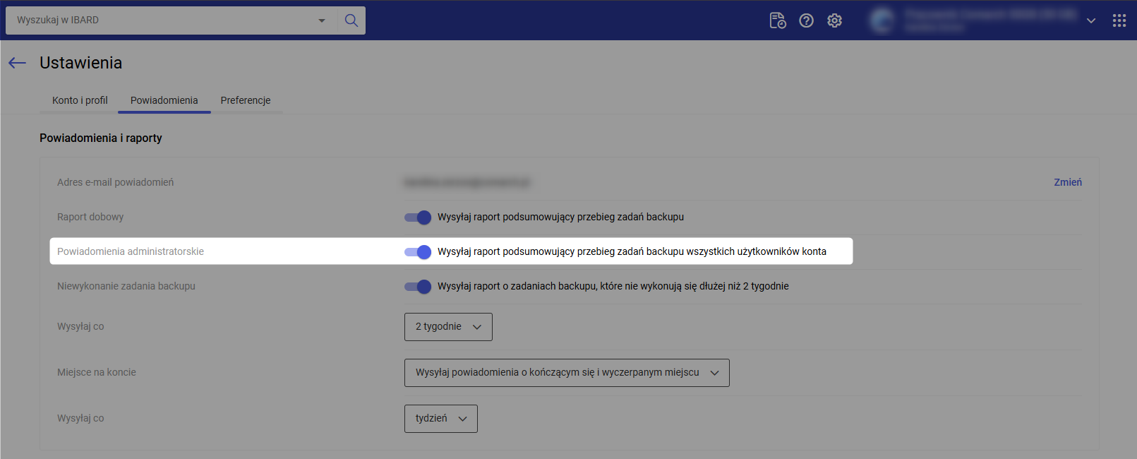 Administrator IBARD może zaznaczyć opcję, która umożliwia otrzymywanie raportu dobowego, który zawiera informacje na temat statusów zadań backupu ze wszystkich kont dodanych do usługi.