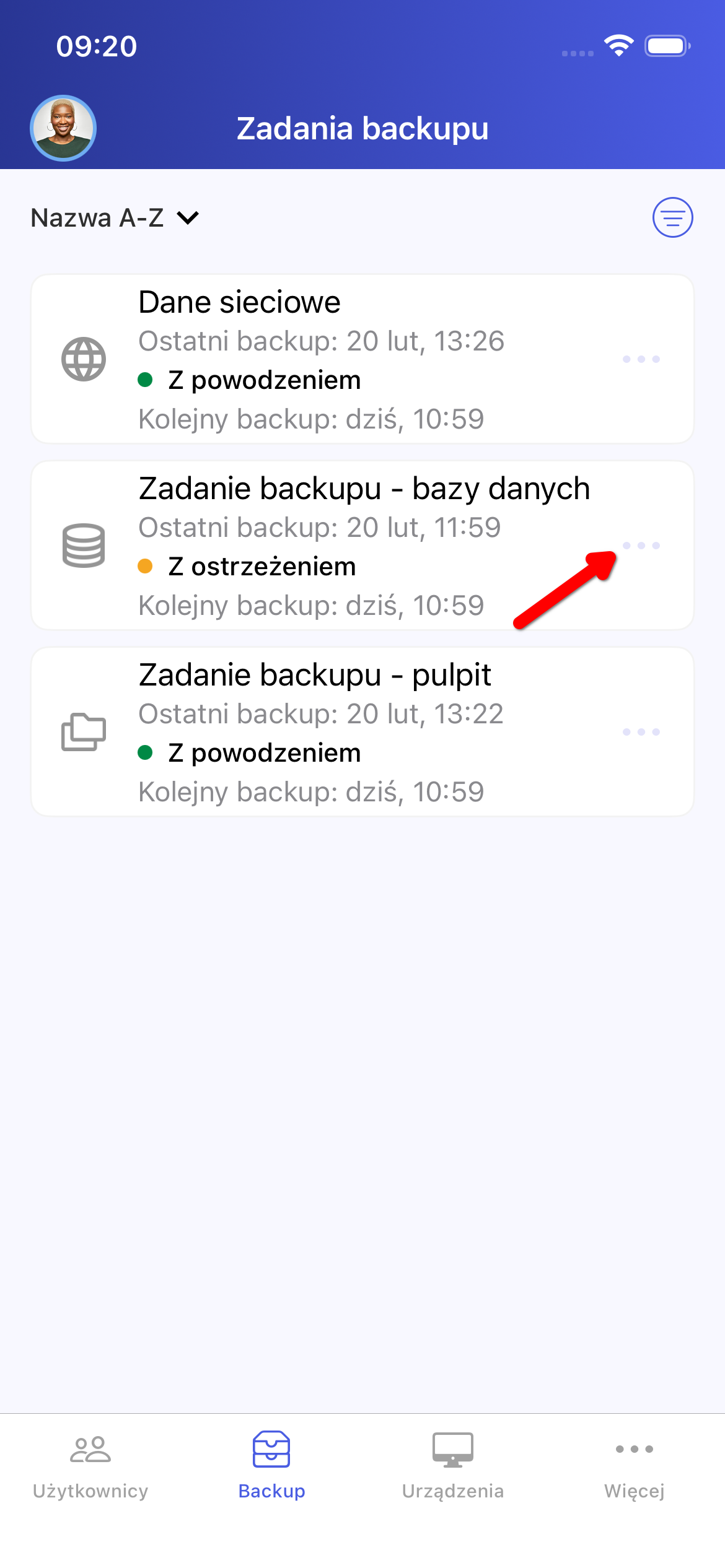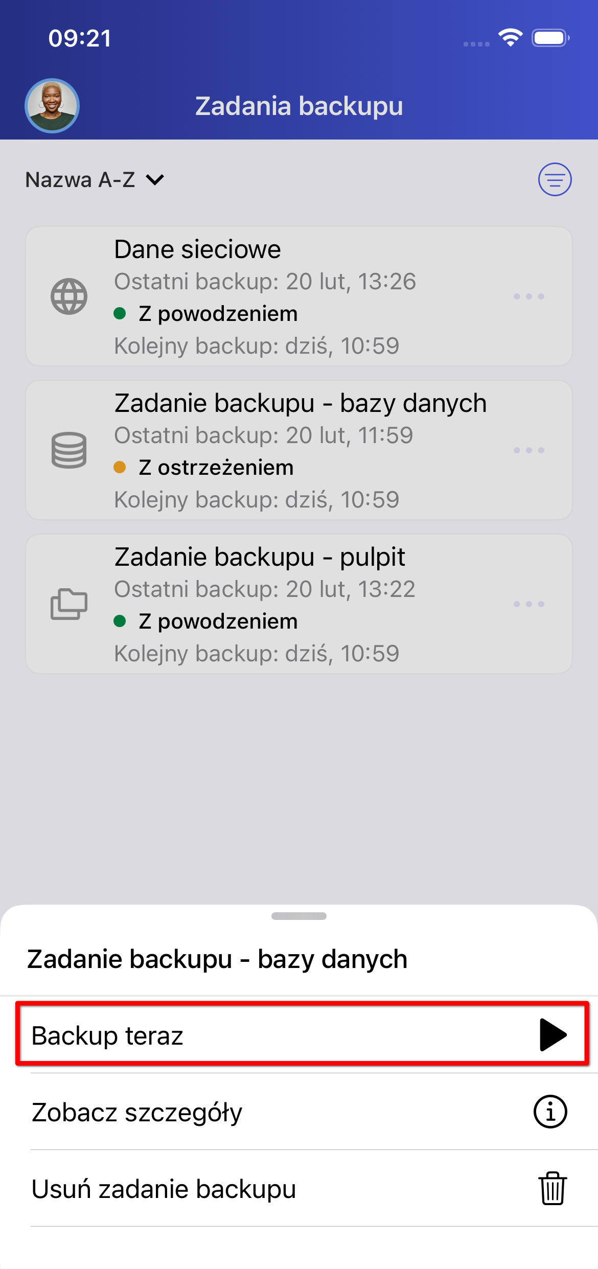 W celu ręcznego uruchomienia zadania należy skorzystać z menu kontekstowego (trzy kropki) i wybrać opcję „Backup teraz” (Rysunek 8).