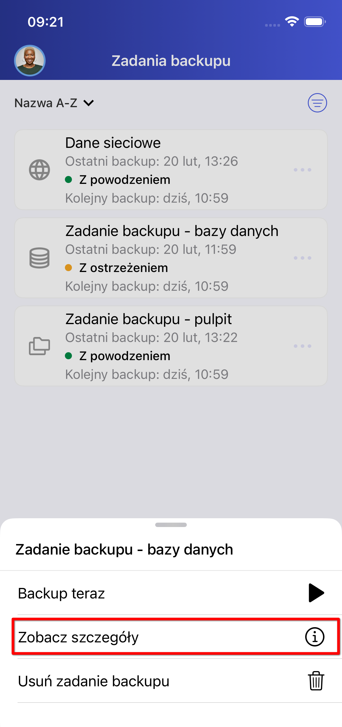 Widok szczegółów zadania backupu
