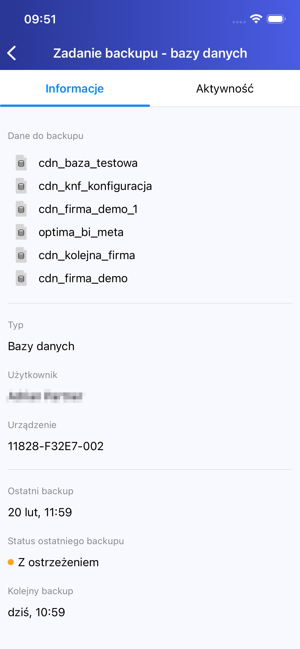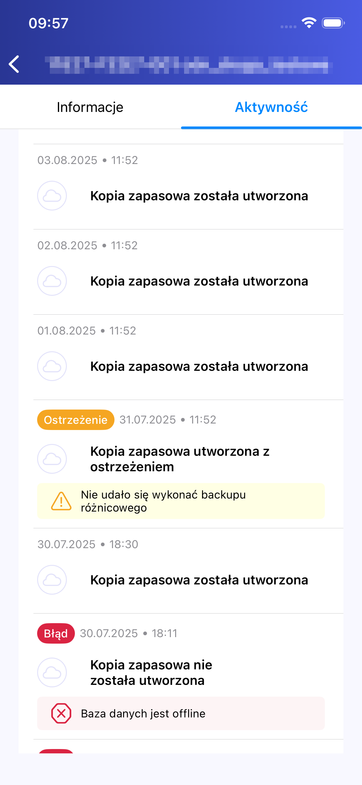 W sekcji „Aktywność” można zweryfikować historię wykonań zadania oraz ich rezultaty. Możliwe statusy to: „Kopia została utworzona”, „Kopia zapasowa utworzona z ostrzeżeniem” oraz „Kopia zapasowa nie została utworzona”. W przypadku wystąpienia problemów wyświetlany jest również powód ich powstania (Rysunek 7).