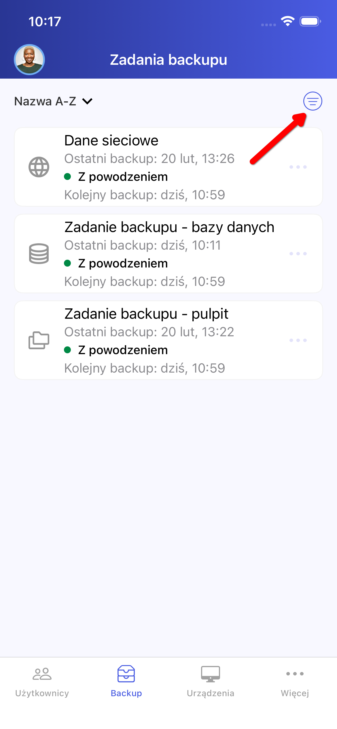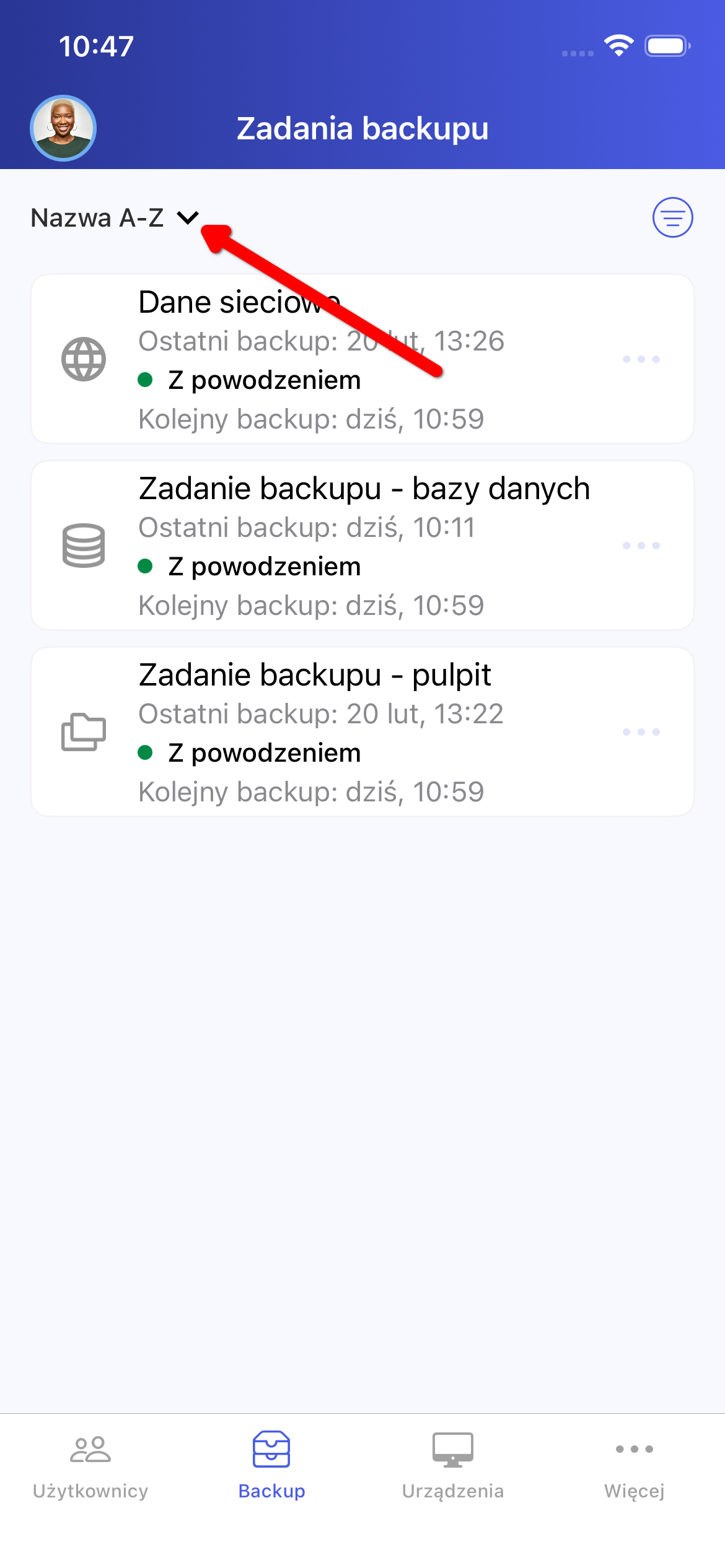 Lista zadań backupu może być sortowana. Domyślnie pozycje ustawione są alfabetycznie (A-Z) według nazwy zadania. Aby zmienić kierunek sortowania, należy kliknąć w przycisk zaznaczony poniżej (Rysunek 24).