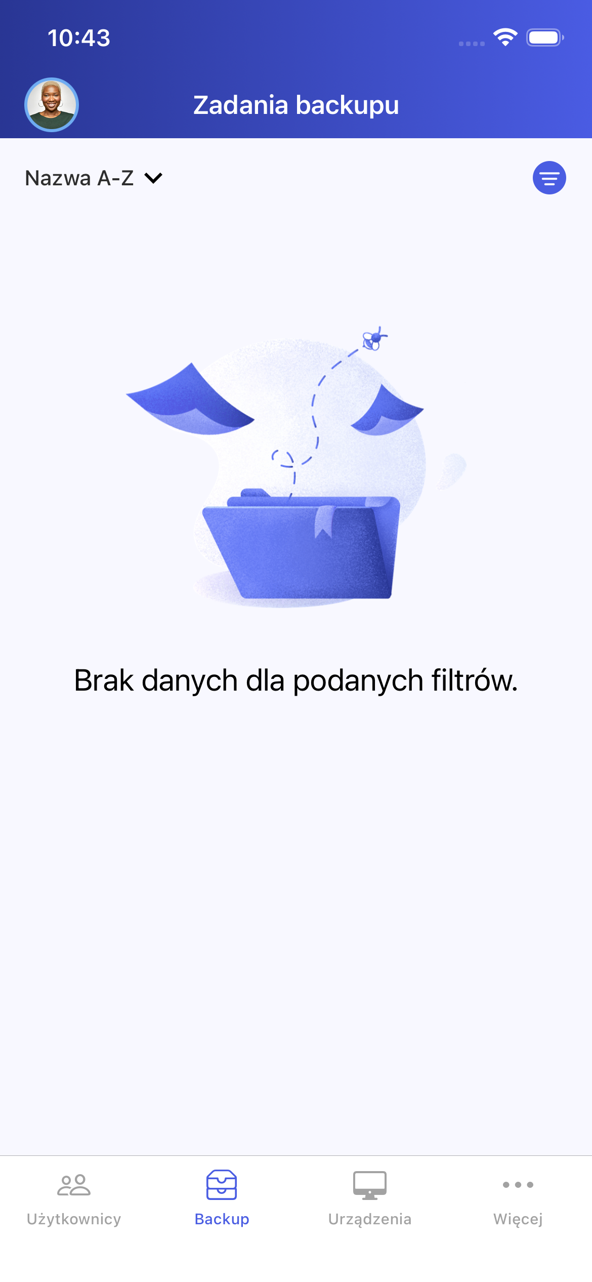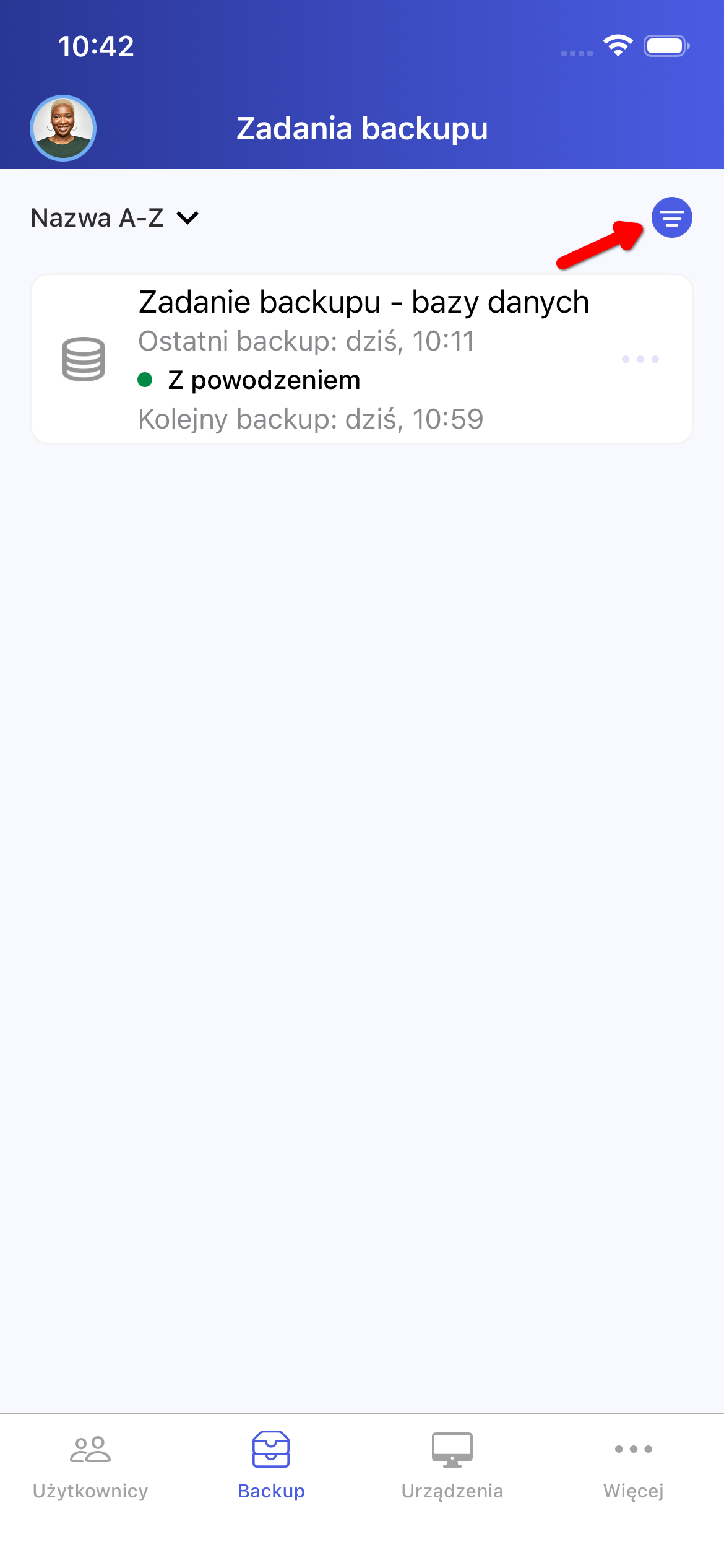 Lista zadań backupu może być filtrowana według określonych kryteriów. Aby otworzyć panel filtrów, należy kliknąć w przycisk zaznaczony poniżej (Rysunek 11).
