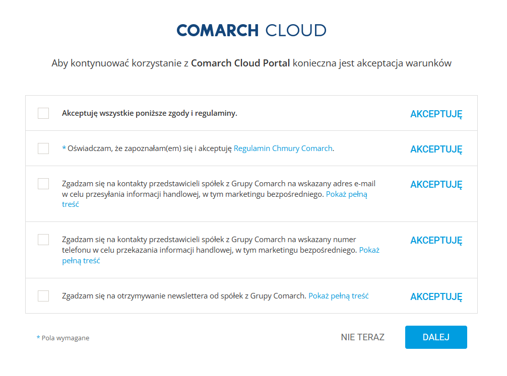 Zaakceptuj regulamin portalu Comarch Cloud, aby uzyskać dostęp do panelu zarządzania produktami.
