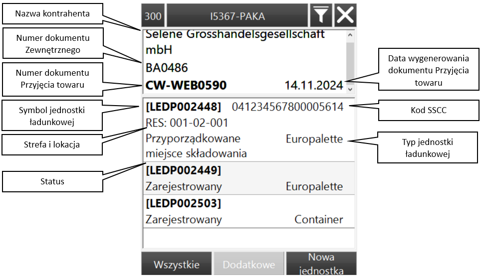 Po uruchomieniu procesu Jednostki ładunkowe wyświetla się lista jednostek ładunkowych utworzonych dla danego przyjęcia.
