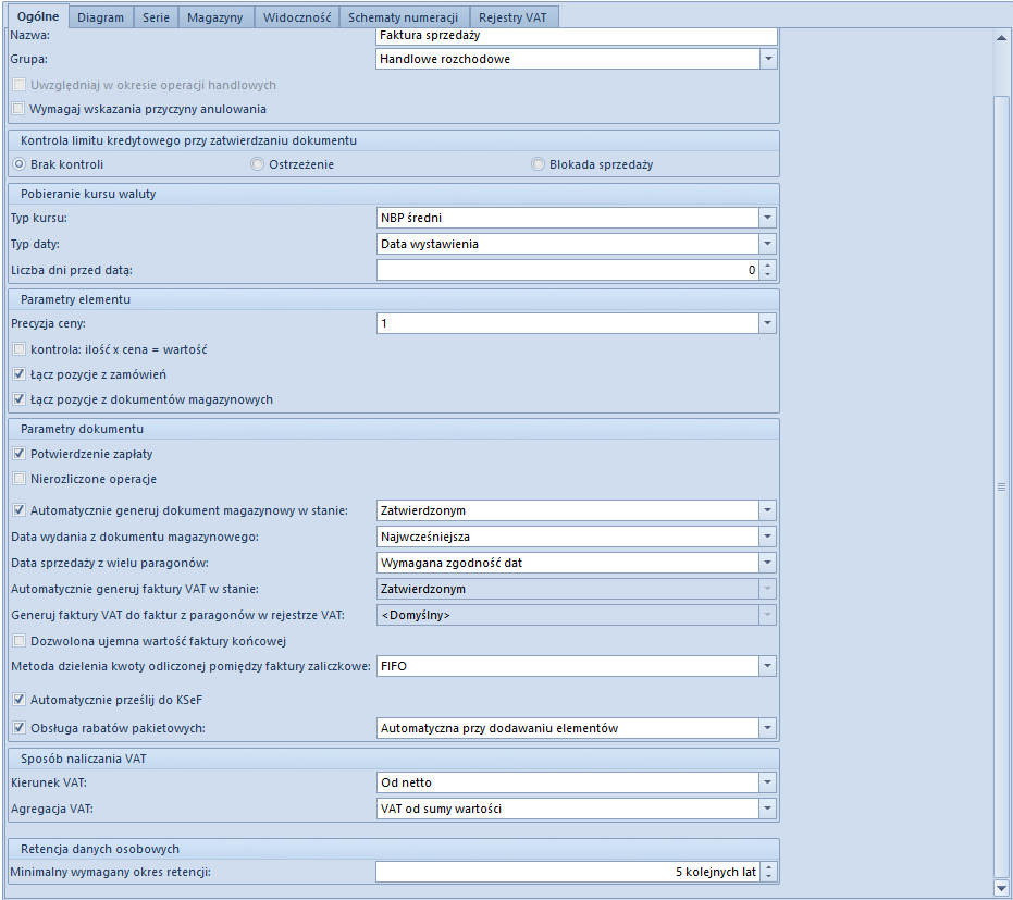2. Na formularzu firmy w zakładce Dokumenty w definicji dokumentu Faktura Sprzedaży w zakładce Ogólne zaznaczyć parametr Automatycznie prześlij do KSeF.