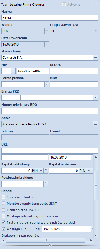 1. Na formularzu firmy w zakładce Konfiguracja\Struktura Firmy\Firma zaznaczyć parametr Obsługa KSeF. Parametr ten prezentowany jest na formularzu wyłącznie, jeżeli Grupa stawek VAT ma ustawioną wartość PL. Po zaznaczeniu parametru prezentowane pole umożliwiające wskazanie daty rozpoczęcia obsługi KSeF (domyślnie ustawiania jest data bieżąca).