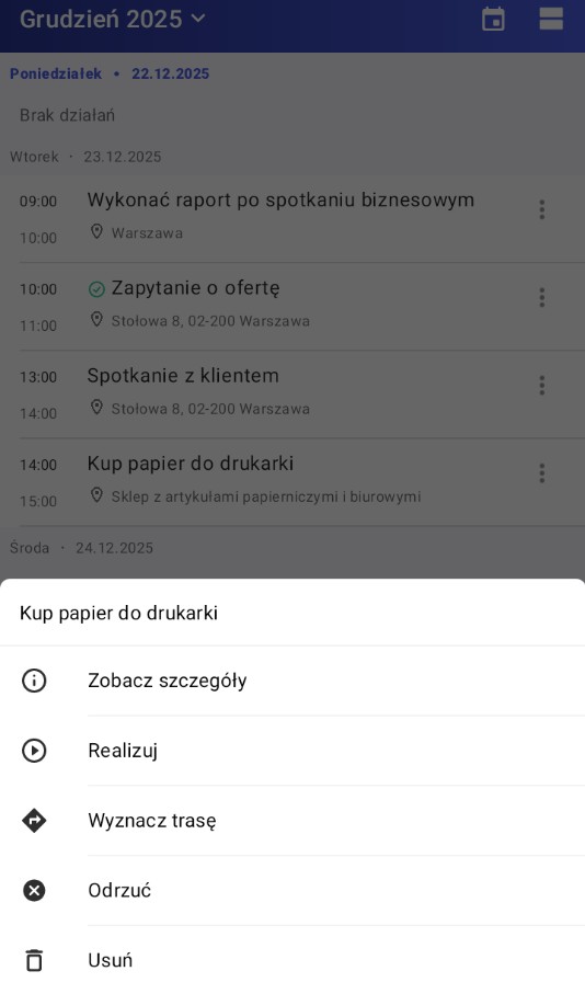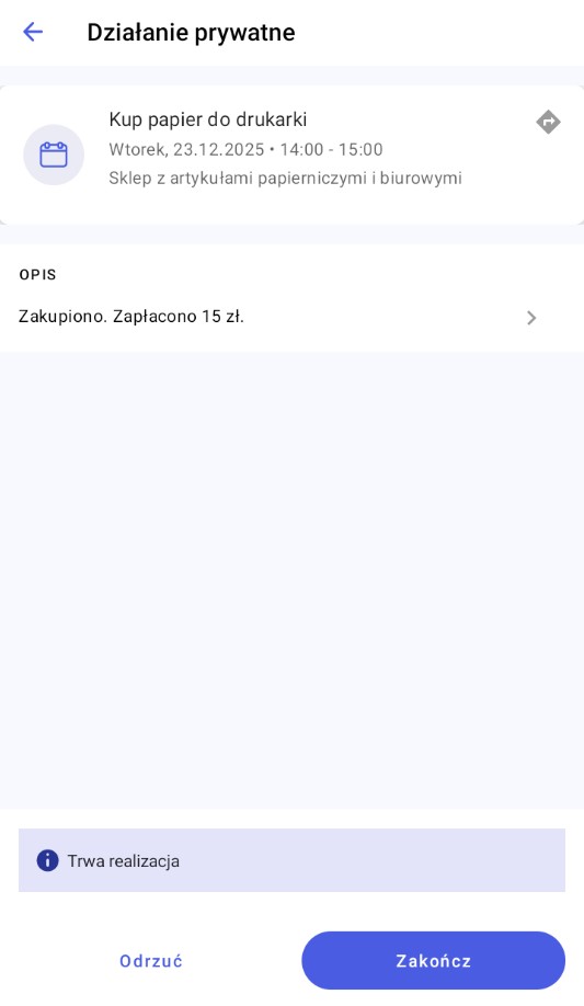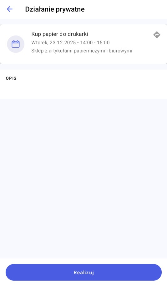 Realizacja działania prywatnego polega na wybraniu przycisku [Realizuj] lub [Odrzuć] dostępnych z poziomu szczegółów działania lub z dostępnego dla działania menu kontekstowego. Wydarzenie prywatne można również usunąć.