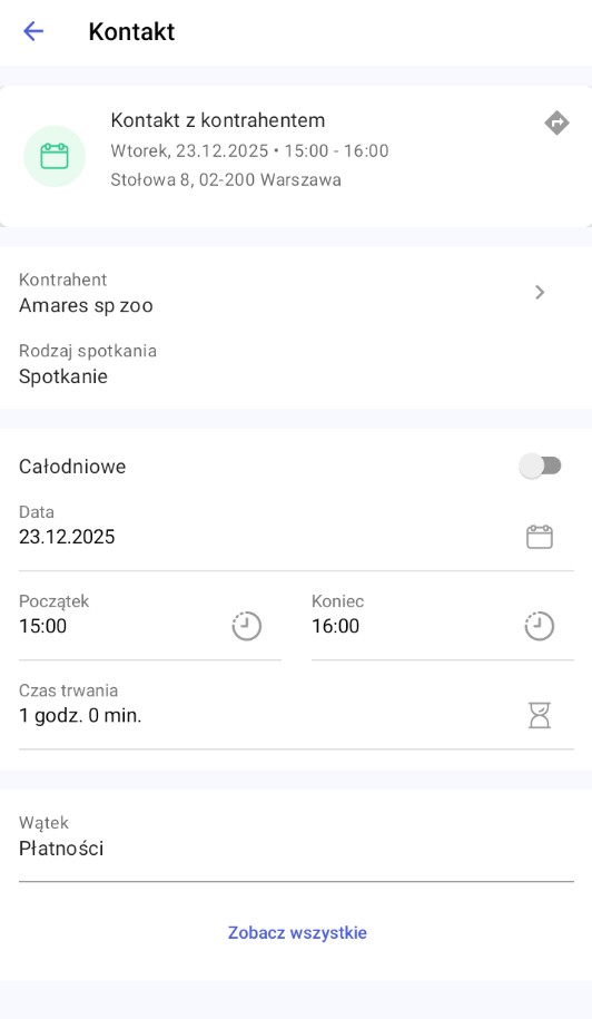 Realizacja działania typu kontakt ogranicza się obecnie do podglądu szczegółów kontaktu oraz weryfikacji wątków kontrahenta.