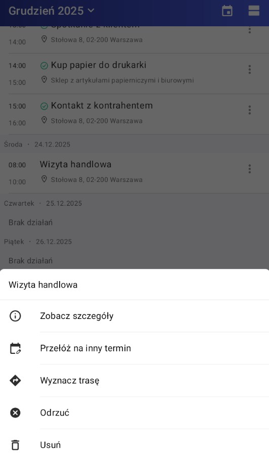 Oprócz podglądu szczegółów, opcje dostępne w menu kontekstowym umożliwiają przełożenie wizyty na inny termin [Przełóż na inny termin], wyznaczenie trasy do miejsca realizacji wizyty [Wyznacz trasę], odrzucenie wizyty [Odrzuć] oraz jej usunięcie [Usuń].
