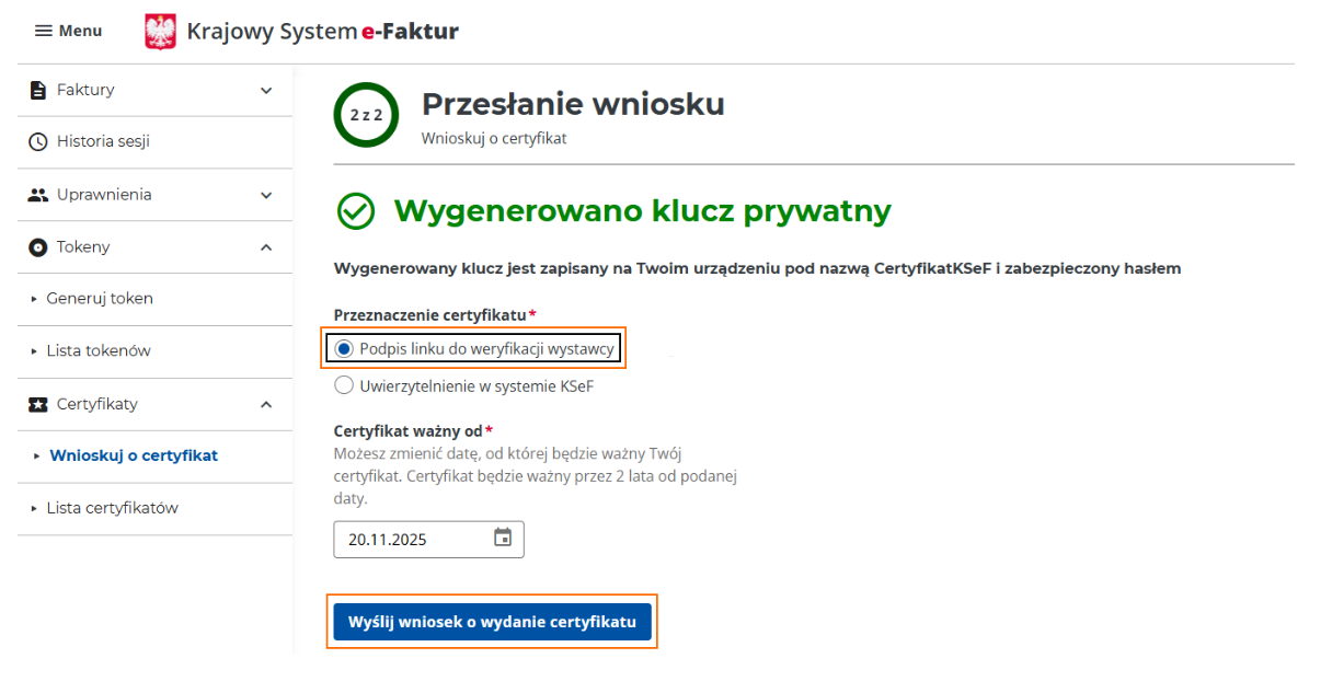 - Zalogować się na stronie Zaloguj – Krajowy System e-Faktur i wygenerować z poziomu Certyfikaty\Wnioskuj o certyfikat pliki z rozszerzeniem *.key i *.crt. Nazwy certyfikatów nie powinny zawierać spacji. Wprowadzone hasło do certyfikatu musi zostać zapamiętane i przechowywane w bezpiecznym miejscu. Zalecanym jest zapisanie certyfikatu w lokalizacji C:\KSEF\.