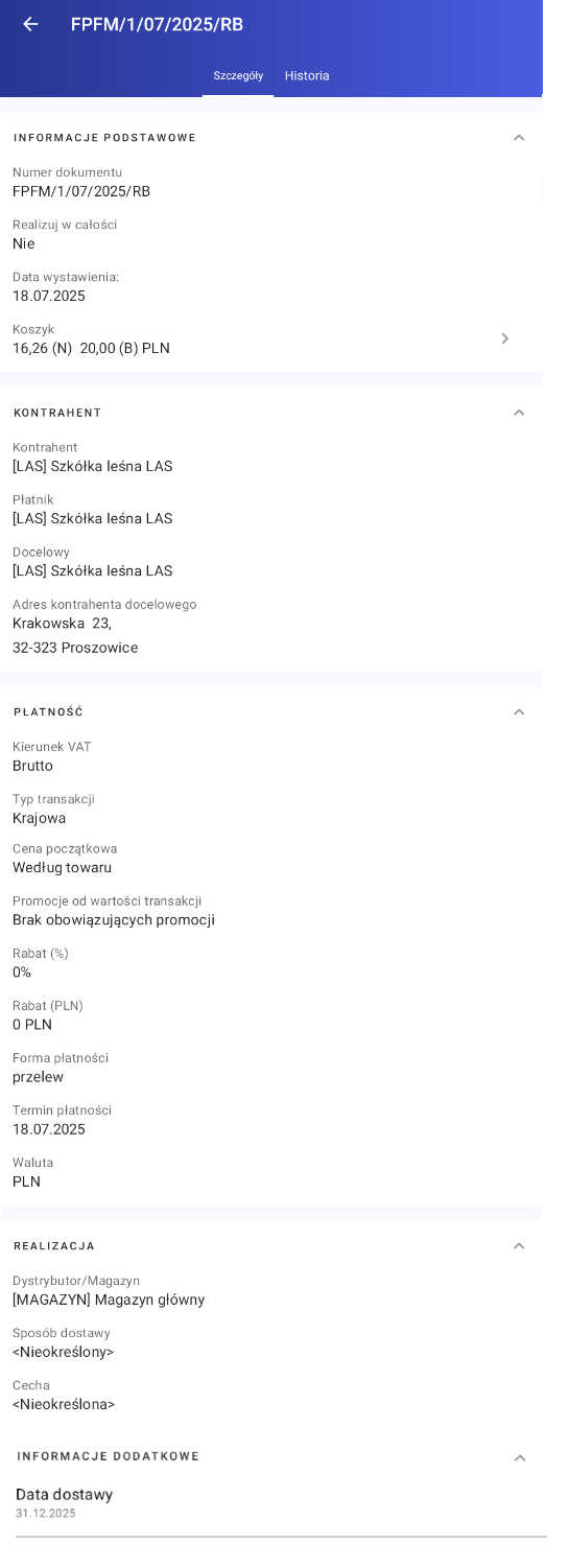 Po wybraniu dokumentu Oferty Sprzedaży na liście dokumentów w aplikacji wyświetlone zostaną szczegóły dotyczące tego dokumentu.