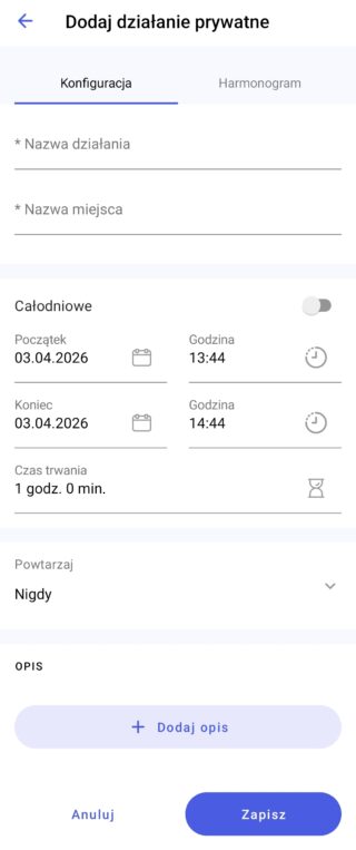 Pola oznaczone gwiazdką są polami wymaganymi do wypełnienia w celu zapisania działania. Podczas planowania działania prywatnego na zakładce Konfiguracja do uzupełnienia możliwe są następujące pola: