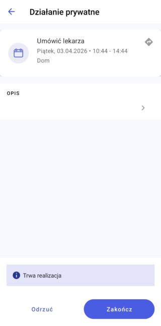 - Opis – sekcja z możliwością dodania treści, analogicznie jak w pozostałych obszarach aplikacji