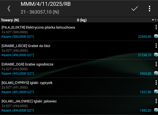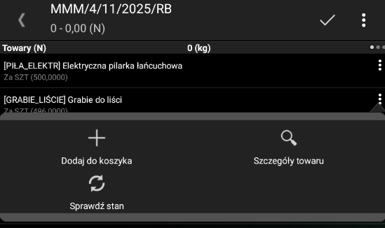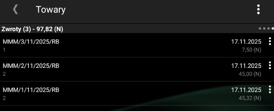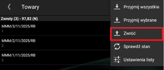 W przypadku, gdy w ustawieniach aplikacji (sekcja: Parametry dokumentów) jest wybrana opcja [Zwrot zasobów: Automatycznie] (opisana TUTAJ), po naciśnięciu przycisku [Zwróć] dostępnego w menu kontekstowym na liście towarów, nastąpi automatyczne dodanie wszystkich pozycji towarowych dostępnych na magazynie na wybrany dokument.
