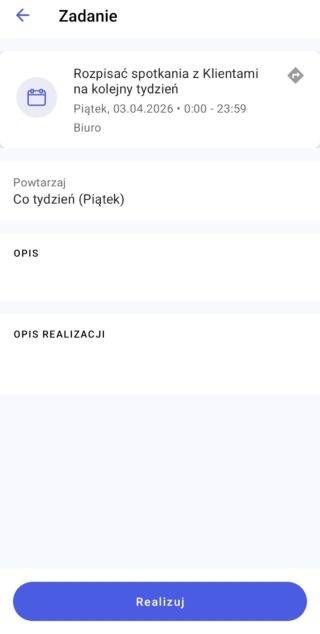 • Parametr Po zrealizowaniu zaplanuj kolejną – spowoduje, że po zrealizowaniu danego działania automatyczne podniesie się okno umożliwiające zaplanowanie kolejnego dla wybranego kontrahenta