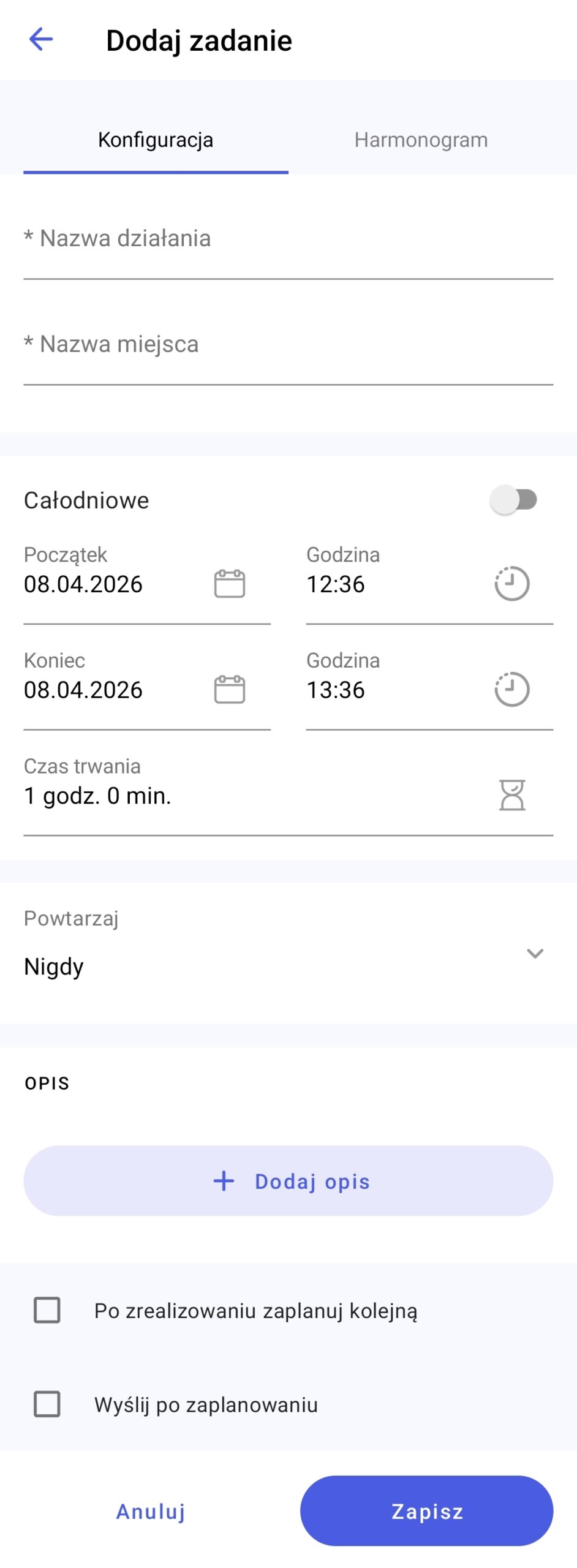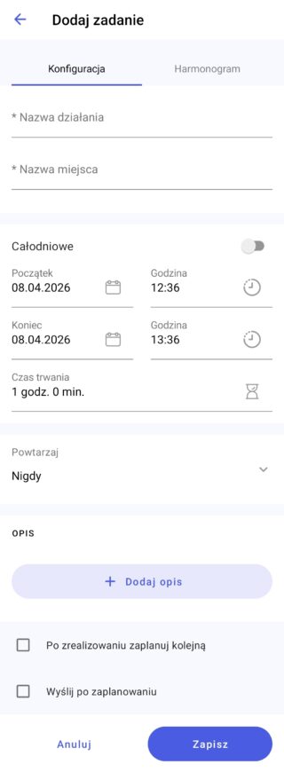 Pola oznaczone gwiazdką są polami wymaganymi do wypełnienia w celu zapisania działania. Podczas planowania zadania na zakładce Konfiguracja do uzupełnienia możliwe są następujące pola: