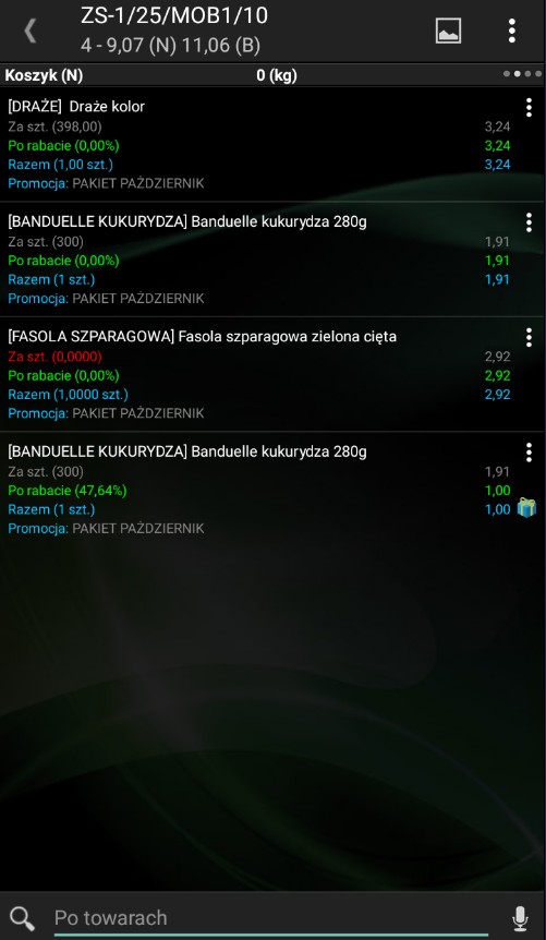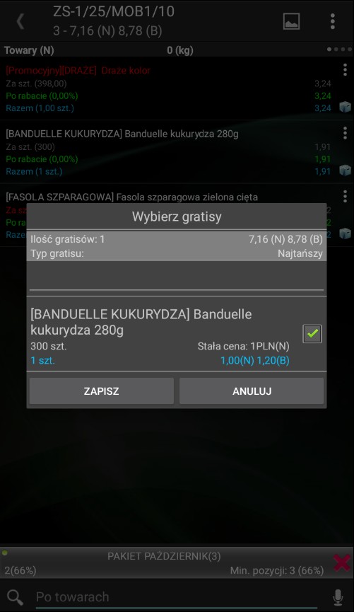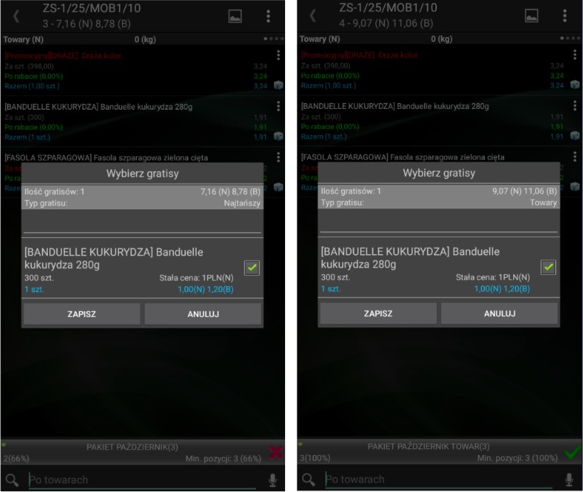 - Rozbijanie pozycji: W przypadku, gdy ilość towaru, który jest najtańszy, jest większa niż ilość przyznawana jako gratis, aplikacja automatycznie rozbije tę pozycję na dwie: jedną jako gratis (z obniżoną ceną) i drugą jako zwykły towar w pakiecie (z jego standardową ceną w pakiecie).