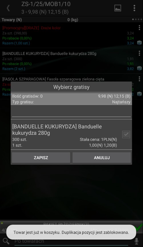 - Jeśli parametr Powielanie pozycji na definicji dokumentu jest ustawiony na Zablokuj, próba rozbicia pozycji na gratis i towar w pakiecie spowoduje wyświetlenie ostrzeżenia: „Towar jest już w koszyku. Duplikacja pozycji jest zablokowana.”.