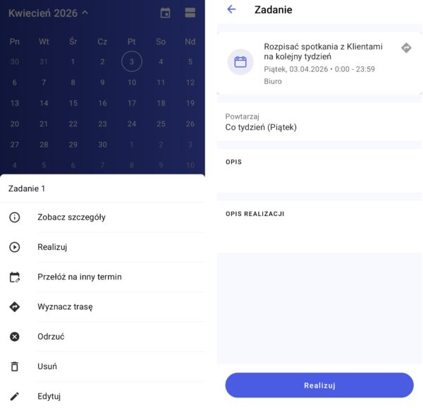 Menu kontekstowe i szczegóły zadania