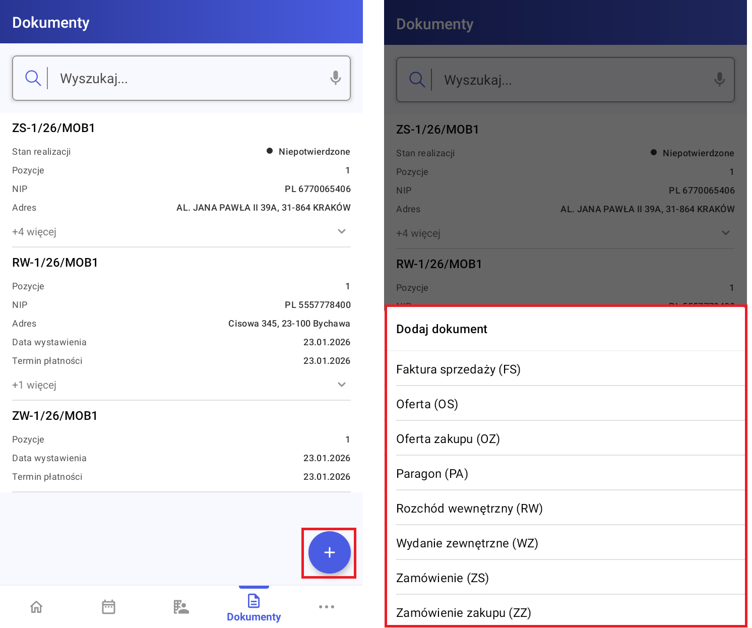 - Wybór kontrahenta, dla którego wystawiany jest dokument,