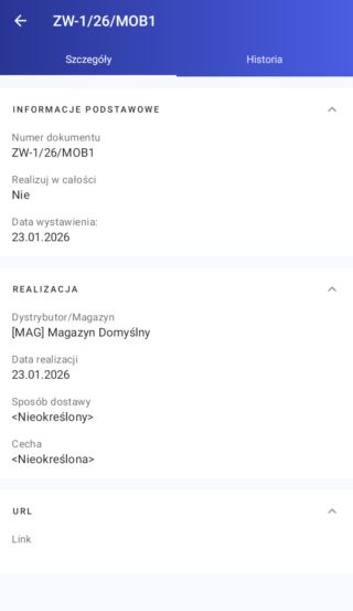 Po wybraniu dokumentu Zamówienia wewnętrznego na liście dokumentów w aplikacji wyświetlone zostaną szczegóły dotyczące tego dokumentu.