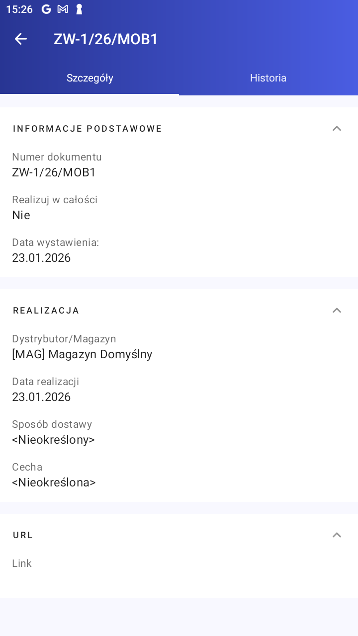 Po wybraniu dokumentu Zamówienia wewnętrznego na liście dokumentów w aplikacji wyświetlone zostaną szczegóły dotyczące tego dokumentu.