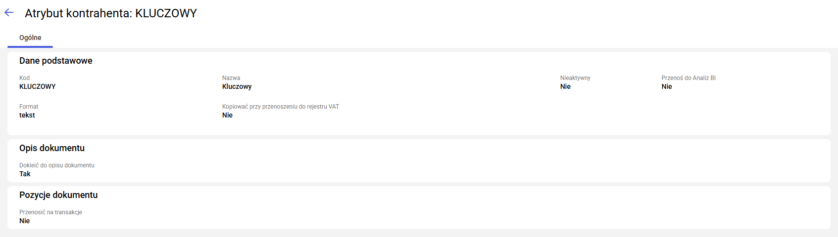 • Nieaktywny – w przypadku zaznaczeniu atrybutu jako nieaktywnego, nie będzie wyświetlany do wyboru na formularzach kontrahentów.