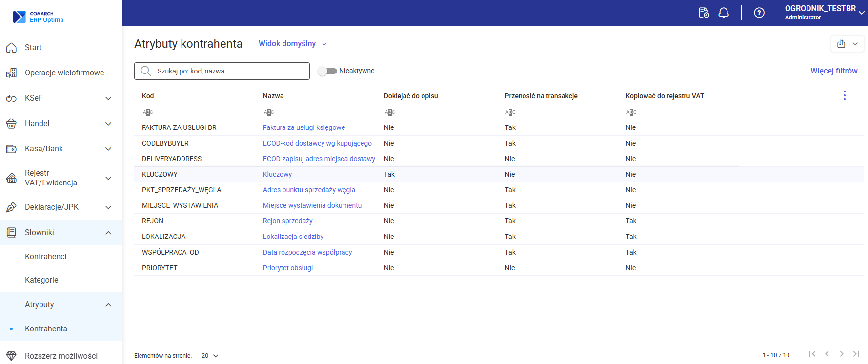 Po rozwinięciu w menu bocznym opcji Słowniki/ Atrybuty/ Kontrahenta wyświetlana jest lista atrybutów kontrahenta dodanych w określonej bazie.