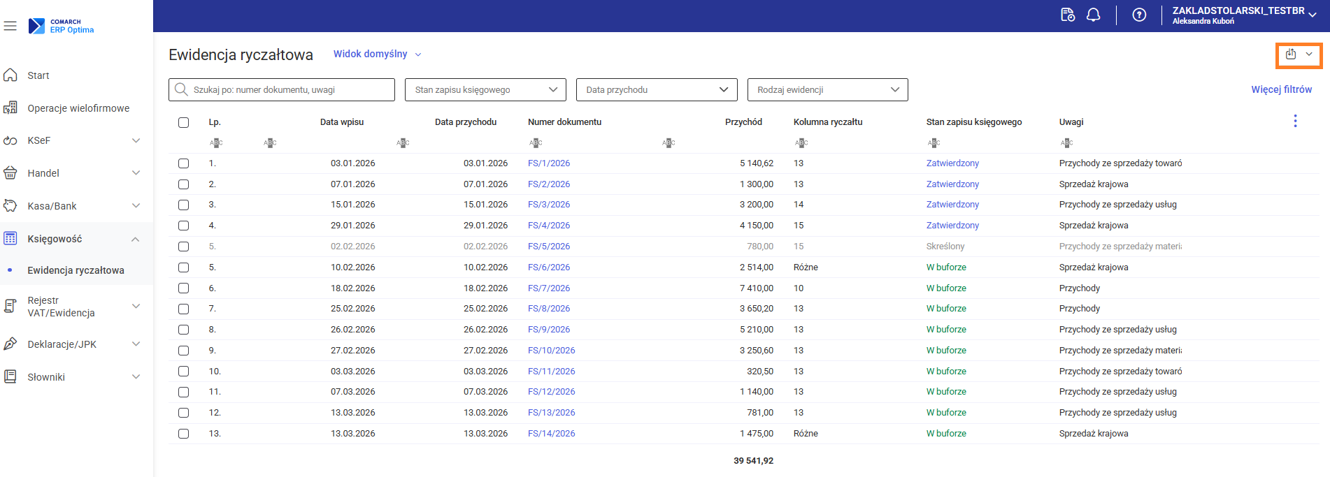 Aby wyeksportować listę zapisów w ewidencji ryczałtowej, należy z poziomu Księgowość > Ewidencja ryczałtowa w prawym górnym rogu kliknąć ikonę