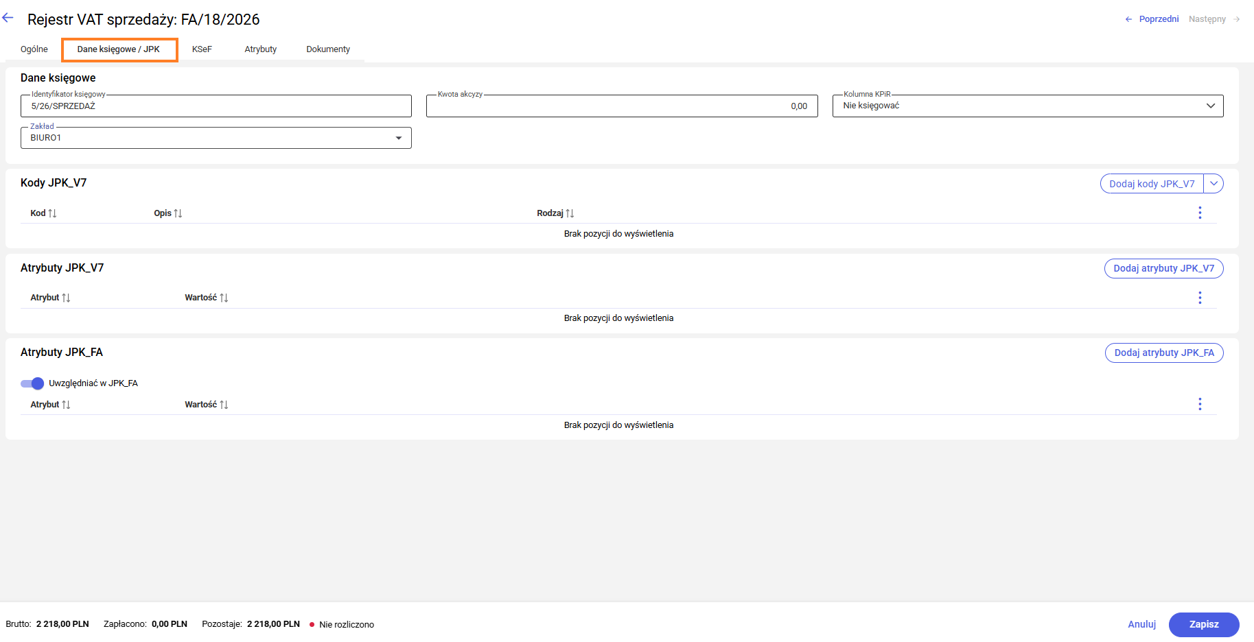 - Przejść do zakładki Dane księgowe/JPK