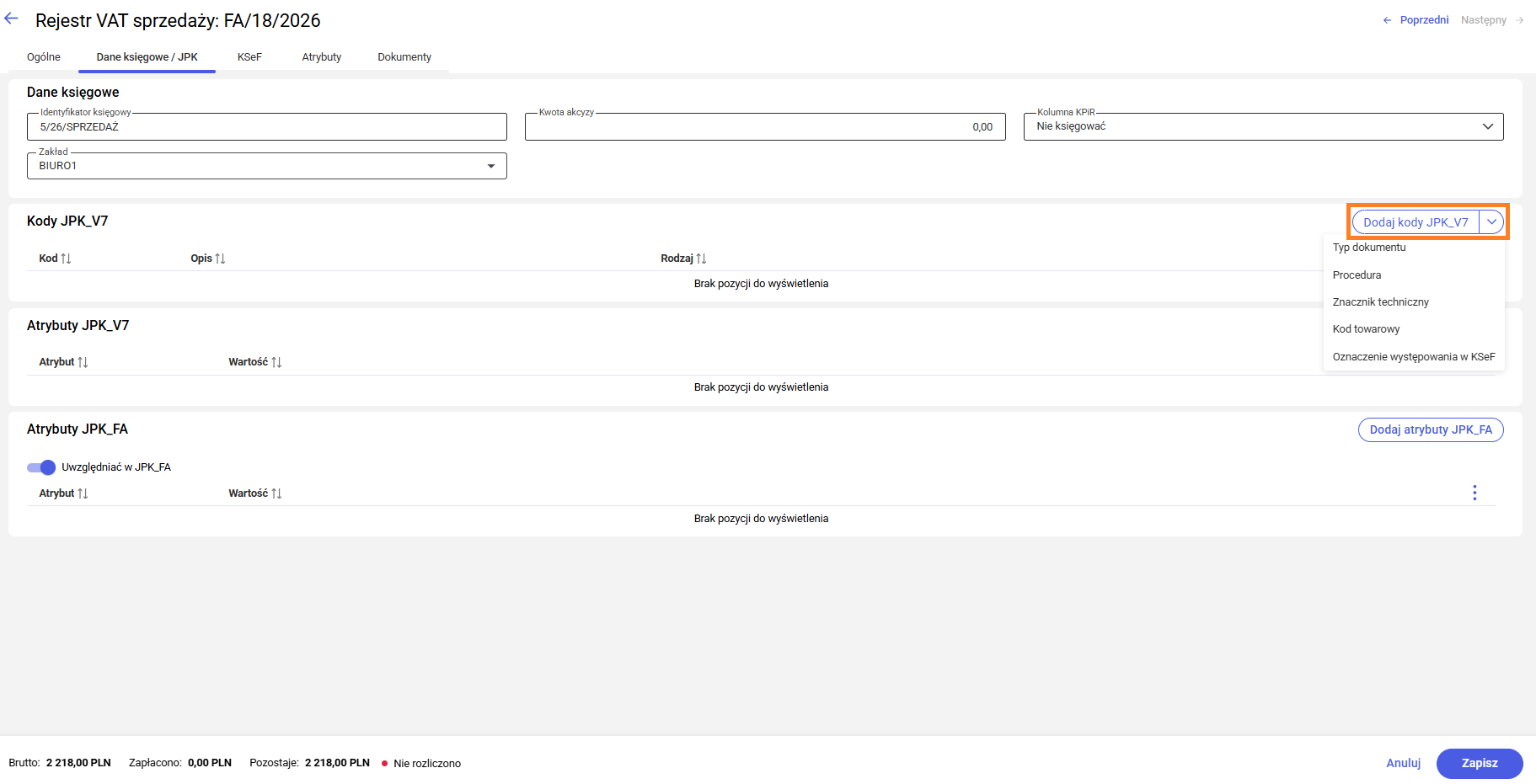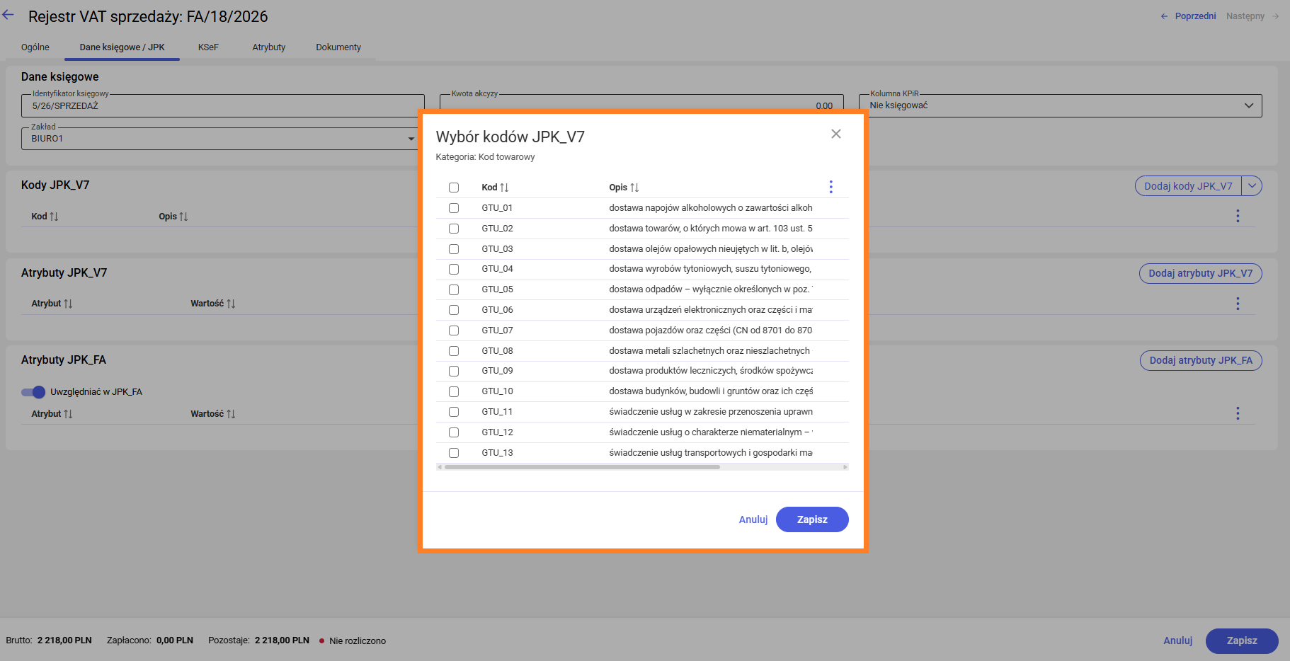 - Zaznaczyć kody JPK_V7, które mają zostać przypisane do dokumentu.