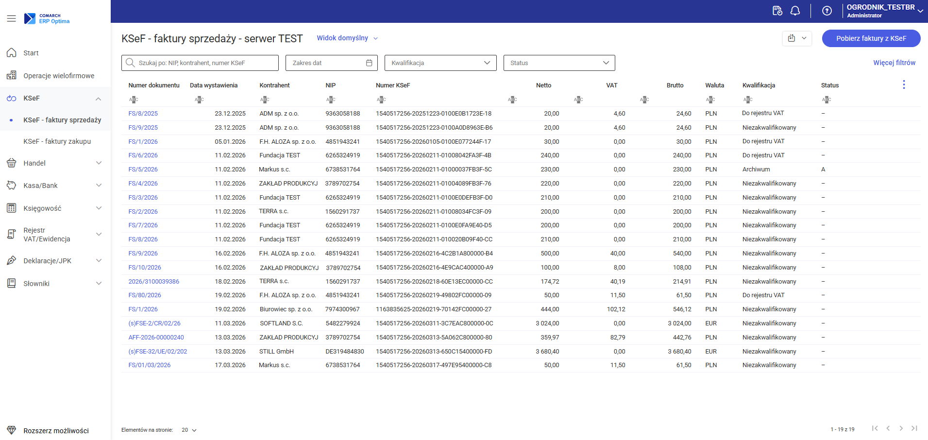 Jeżeli powyższe warunki są spełnione, po wyborze jednej z tych opcji w menu wyświetlana jest lista faktur sprzedaży / zakupu pobranych z KSeF: