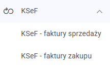 Po rozwinięciu w menu bocznym opcji KSeF pojawiają się do wyboru pozycje KSeF – faktury sprzedaży oraz KSeF – faktury zakupu: