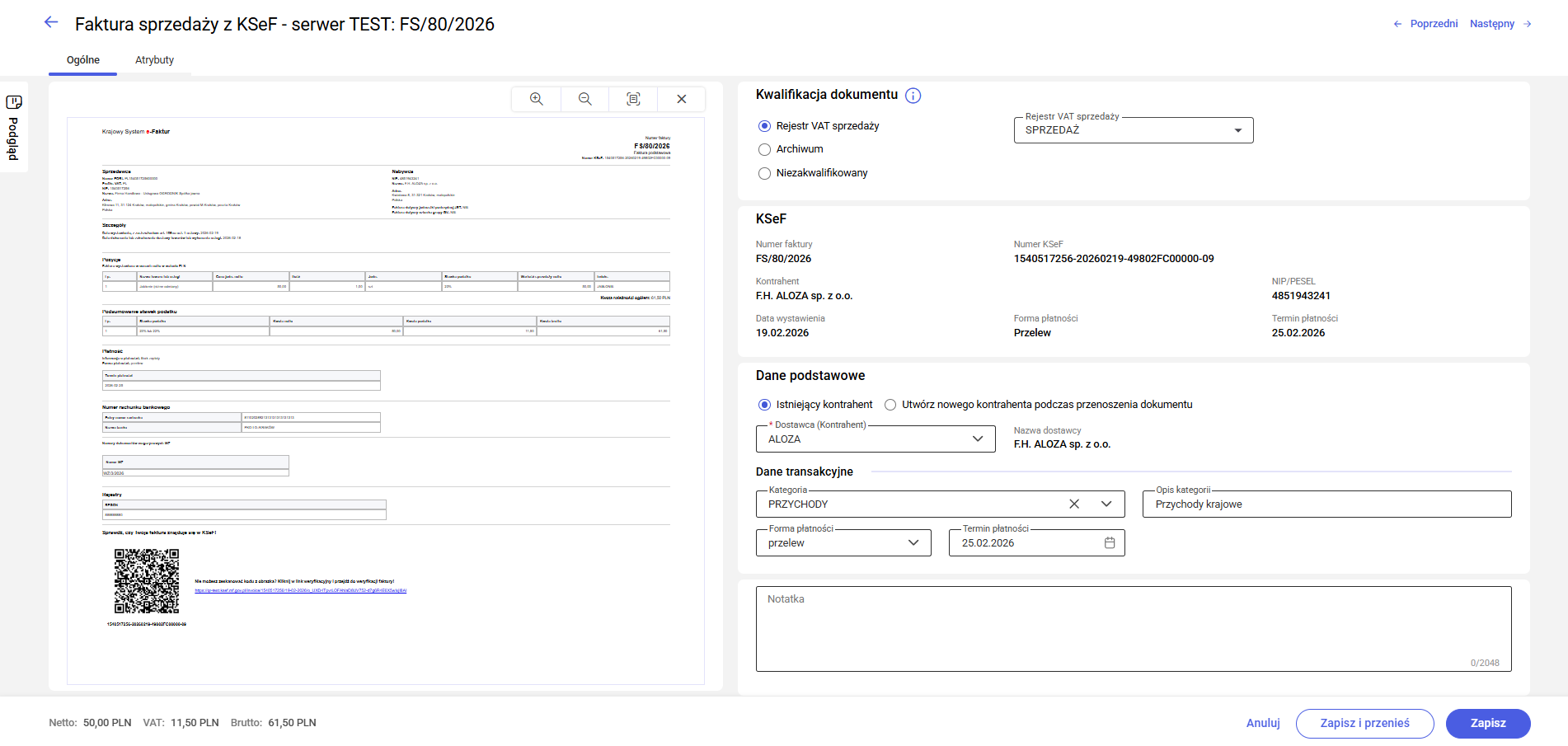 Po kliknięciu na liście faktur sprzedaży / zakupu z KSeF na numer dokumentu otwierany jest formularz faktury. Po lewej stronie znajduje się podgląd wizualizacji dokumentu a po prawej dane z dokumentu: