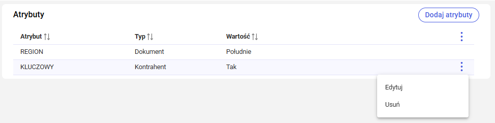 Na zakładce możliwe jest przypisanie do faktury pobranej z KSeF atrybutów, które zostaną przeniesione wraz z dokumentem do rejestru VAT / faktur zakupu. Po kliknięciu na przycisk Dodaj atrybuty możliwe jest wskazanie jednego bądź większej ilości atrybutów. Na dodanym już atrybucie po kliknięciu na ikonę z trzema kropkami dostępne są opcje Edytuj oraz Usuń.
